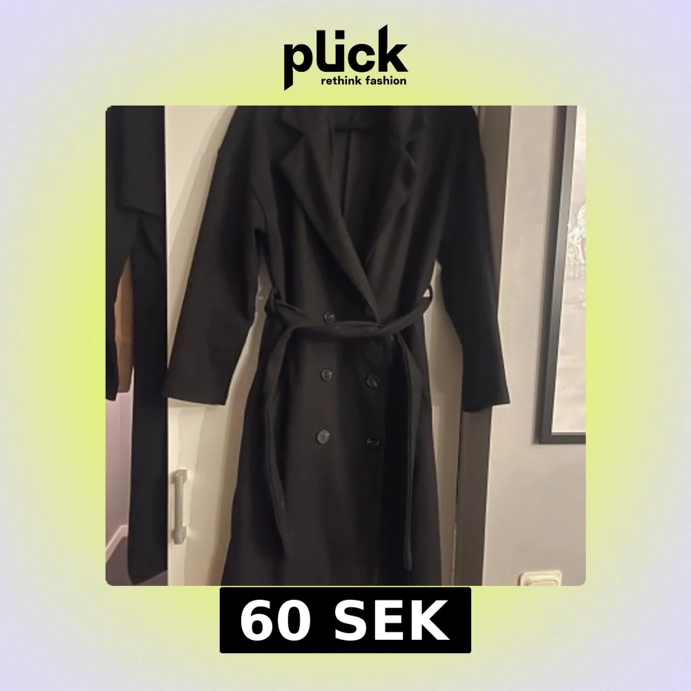 Säljer en svart kappa med klassisk krage, knappar framtill och ett matchande bälte i midjan. Långärmad och med stilren design, perfekt för dig som gillar en clean look. Passar dig som vill ha en tidlös jacka med snygg siluett.