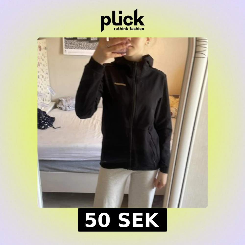 50kr Svart hoodiejacka från A-Z med dragkedja framtill och två fickor. Jackan har huva och en enkel, stilren design utan synliga mönster. Perfekt för lager-på-lager och funkar året runt. Passar XS-M (med reflex)