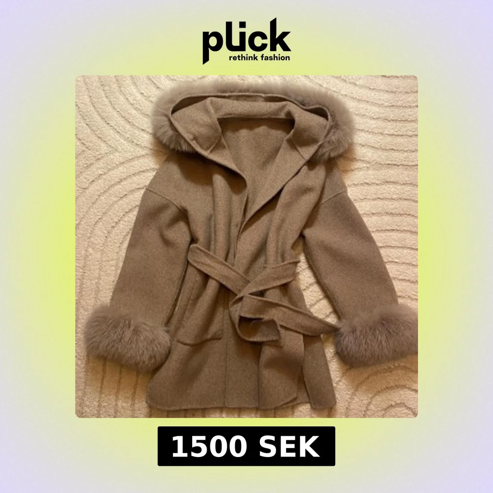 Snygg beige kappa med fluffiga pälsdetaljer på huva och ärmslut. Jackan har knytbälte i midjan, stora fickor framtill och en oversized huva. Materialet är ull och päls, perfekt för kalla dagar. Orginalpris - 2999 Nypris - 1500