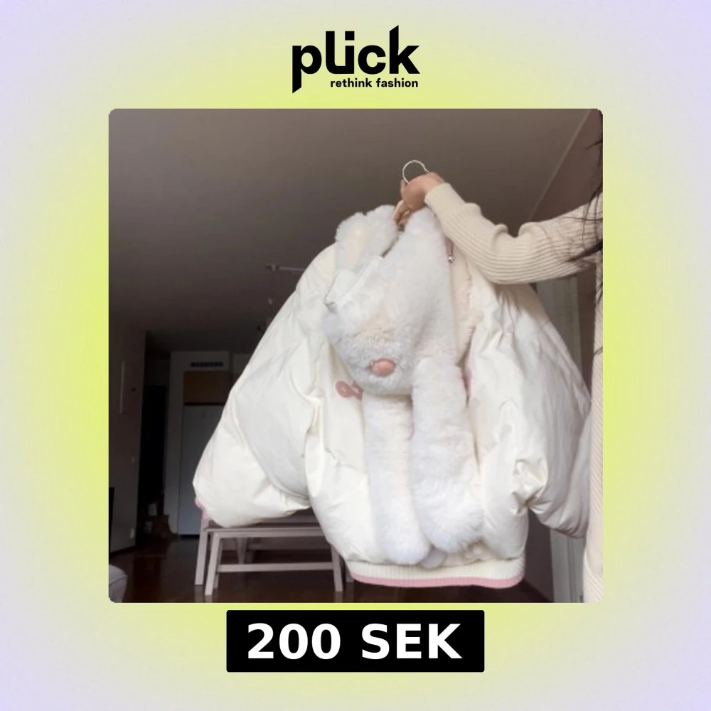 Supergullig vit pufferjacka med stor fluffig kaninhuva och långa öron. Jackan har rosa detaljer och ribbad mudd nertill. Perfekt för dig som vill sticka ut och gillar söta detaljer.