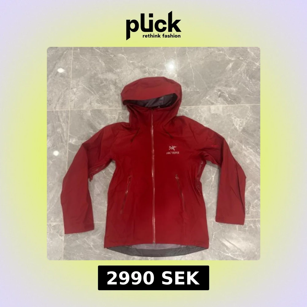 Snygg röd vindjacka från Arc'teryx med Gore-Tex-material, perfekt för regniga dagar. Jackan har huva, hel dragkedja framtill och två praktiska fickor med dragkedja. Logga på bröstet och diskret Gore-Tex-märke på ärmen. Stilren och funktionell design.
