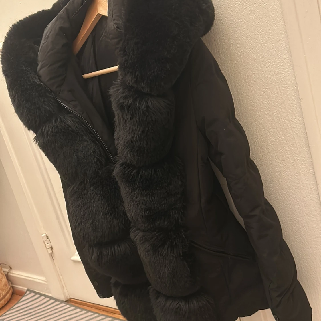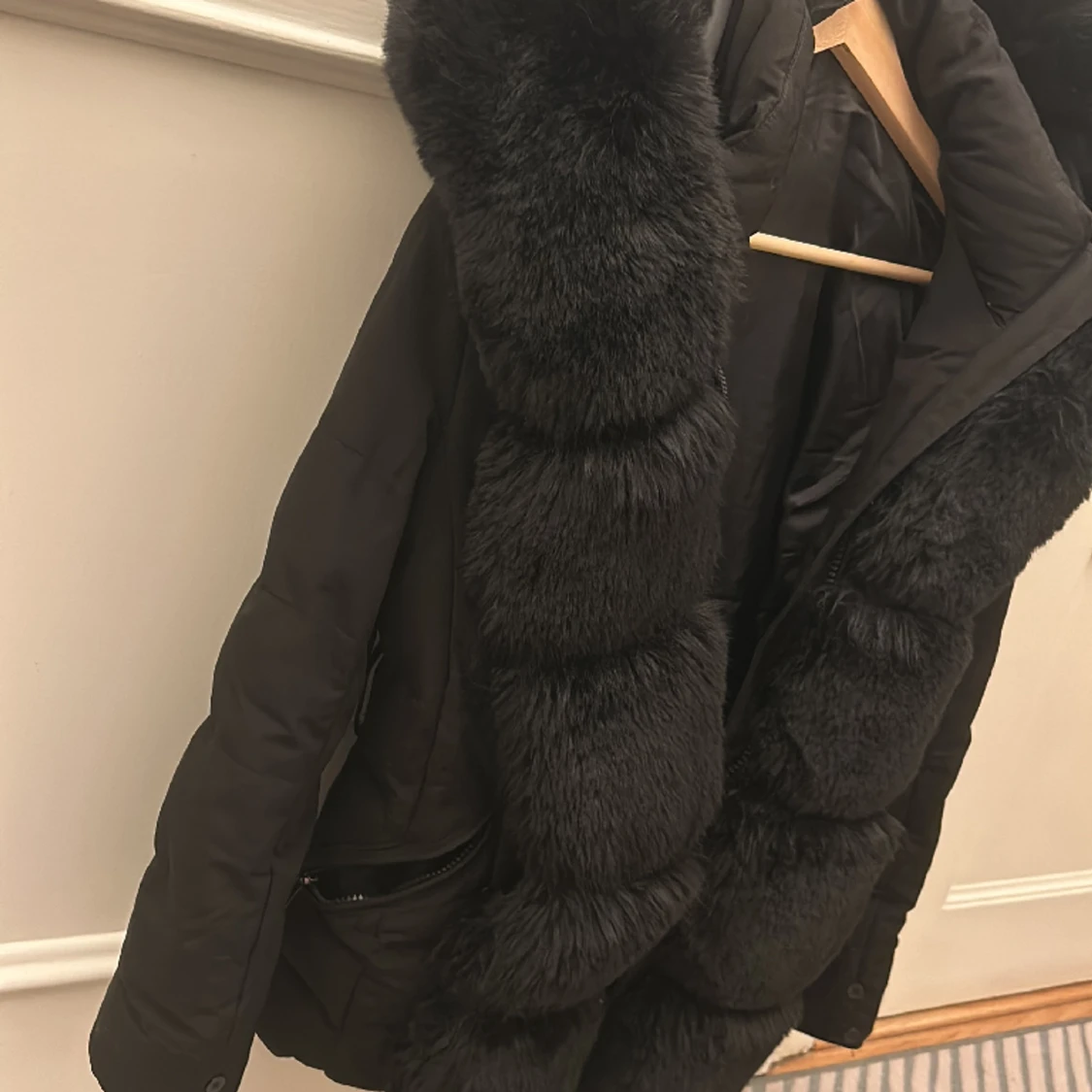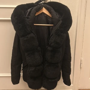 Hej jackan har inga skador Fickorna och allt funkar på den men det ska vara päls på armarna men de har ju tatt bort så det kommer inte finnas päls på armarna men annars är det päls på hela jackan typ