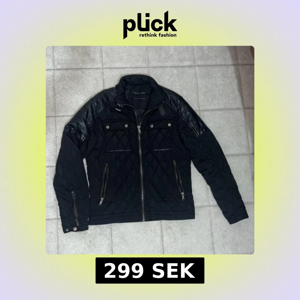 Svart quiltad jacka från Zara Man med coola skinnpaneler på axlarna. Jackan har dragkedja framtill, två bröstfickor med knappar och två snedställda fickor med dragkedja. Snygg ståkrage med spänne och detaljerade sömmar för en modern look.