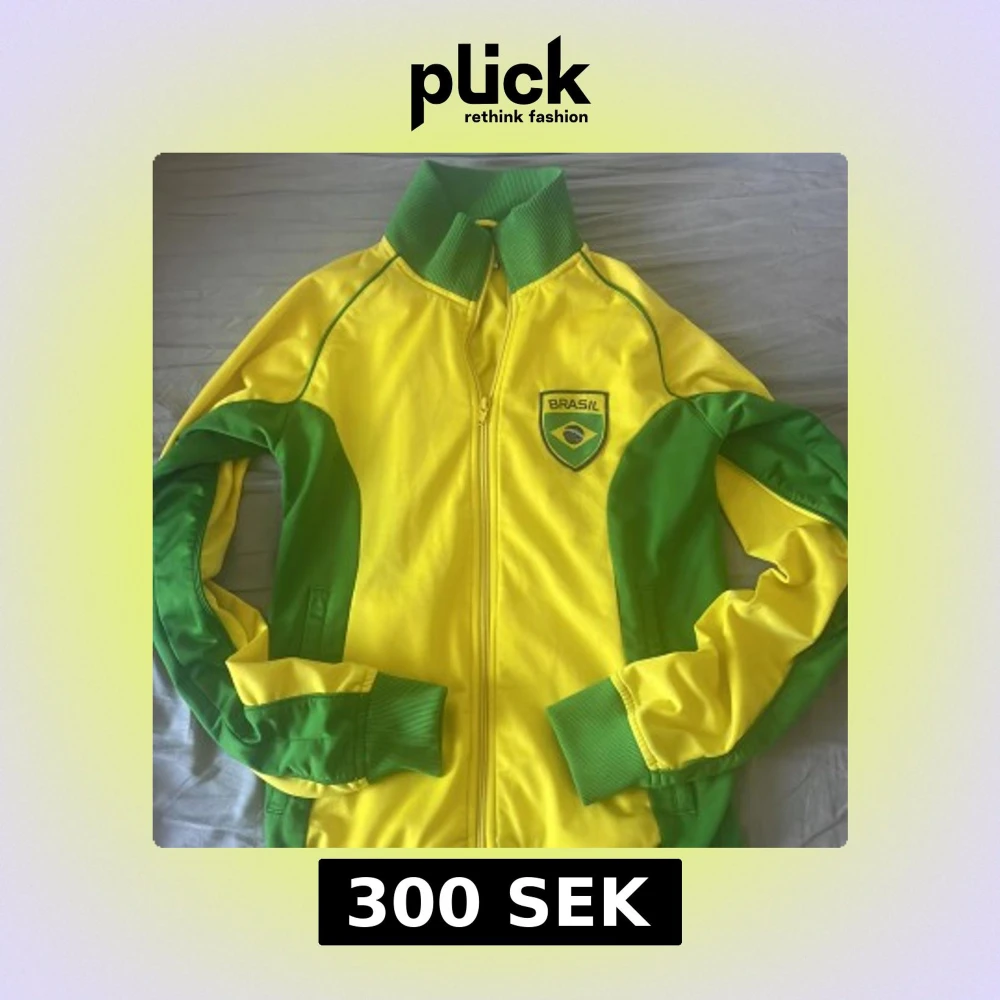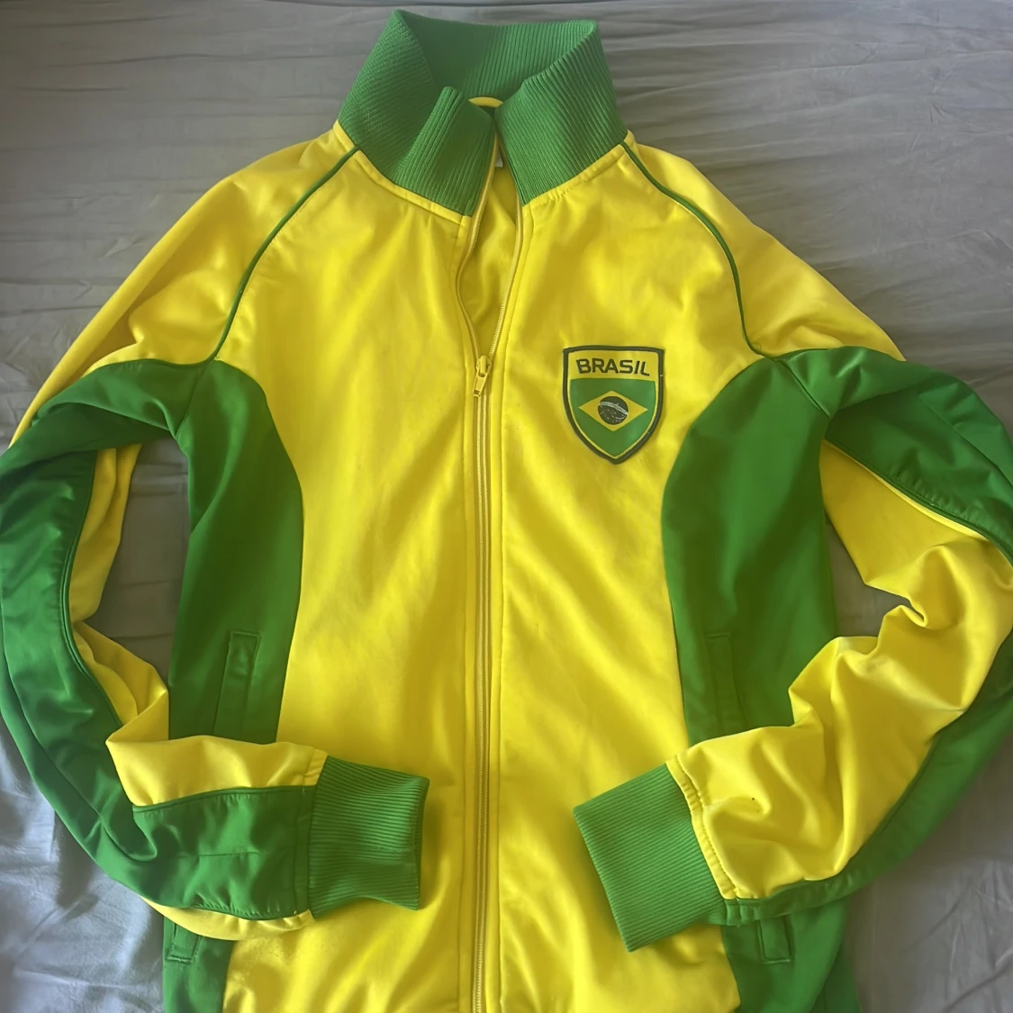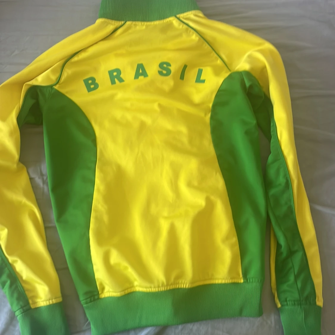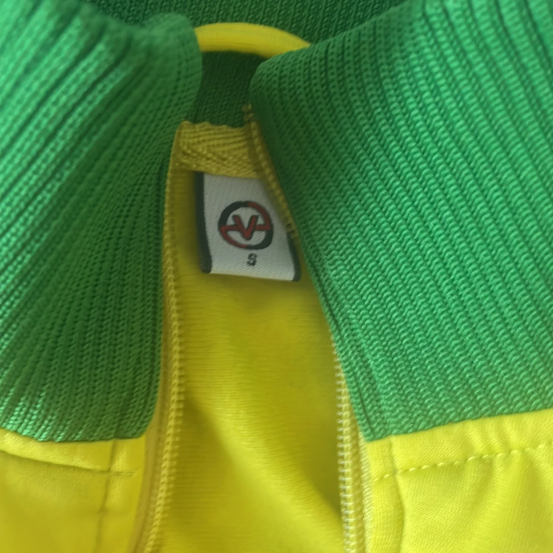 Gul och grön track jacket med Brasil-tryck fram och bak. Jackan har hög krage, ribbade muddar och dragkedja framtill. Snygga gröna paneler längs ärmar och sidor, samt Brasil-märke på bröstet. Perfekt för dig som älskar fotboll och vill sticka ut.