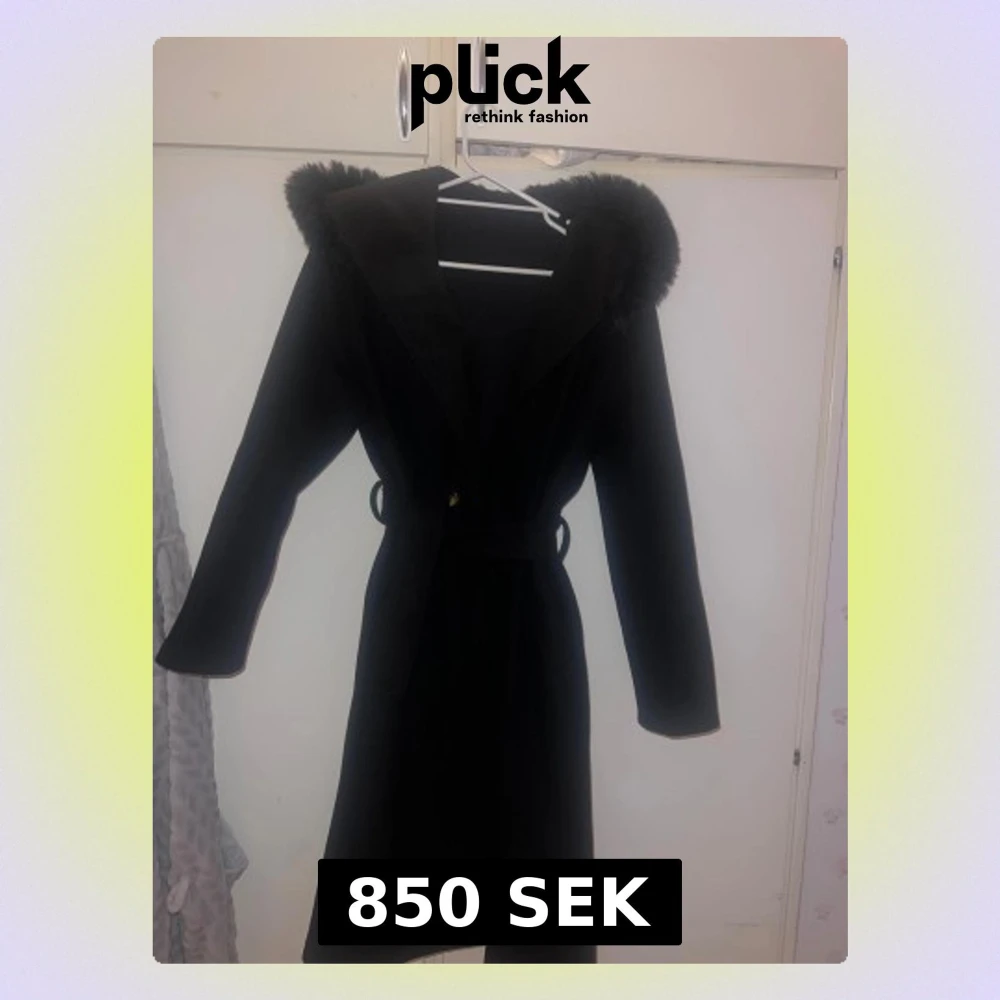 Säljer en svart lång kappa med huva som har fluffig pälsdetalj. Jackan har bälte i midjan för snygg passform och långa ärmar. Perfekt för dig som vill ha en stilren och varm look under höst och vinter.