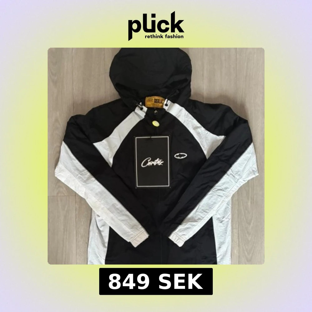 Svart och vit vindjacka från Corteiz med huva och dragkedja. Jackan har kontrasterande vita paneler längs ärmar och sidor, samt Corteiz-logga på bröstet och ryggen. Tillverkad i lätt polyester, perfekt för streetwear-stil. Långärmad och med elastiska muddar. Helt oanvänd med prislapp på!