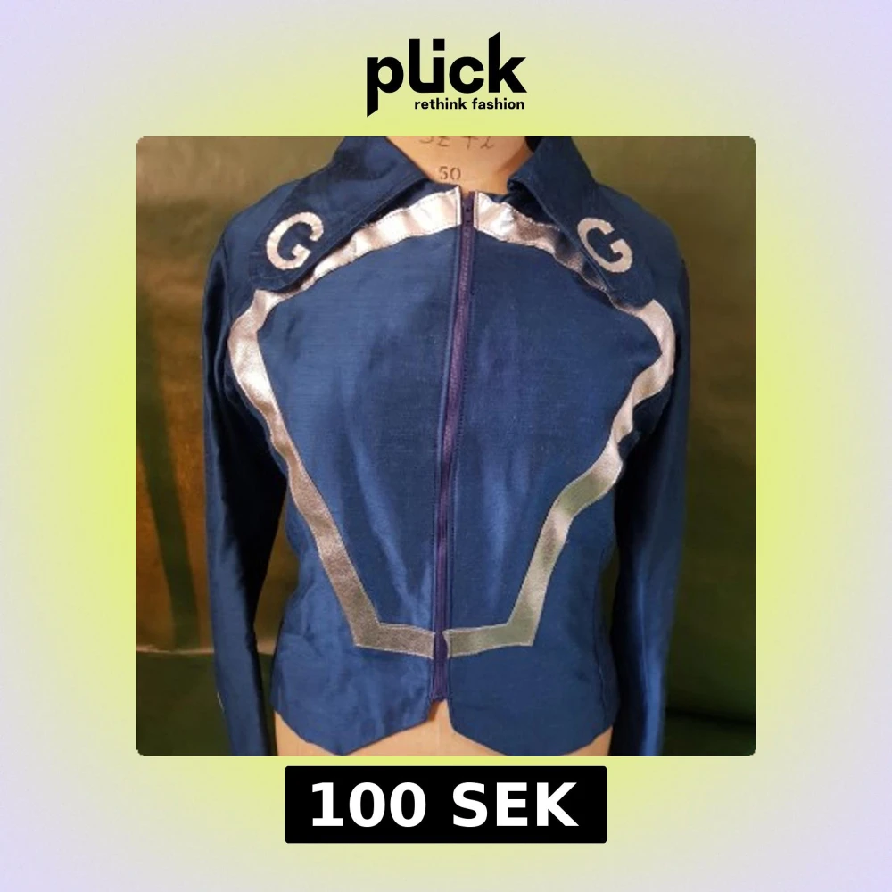 Snygg blå jacka med silvriga vågformade detaljer och dragkedja framtill. Jackan har krage och lång ärm, samt dekorativa G-bokstäver på axlarna. Perfekt för dig som vill sticka ut med en unik stil.
