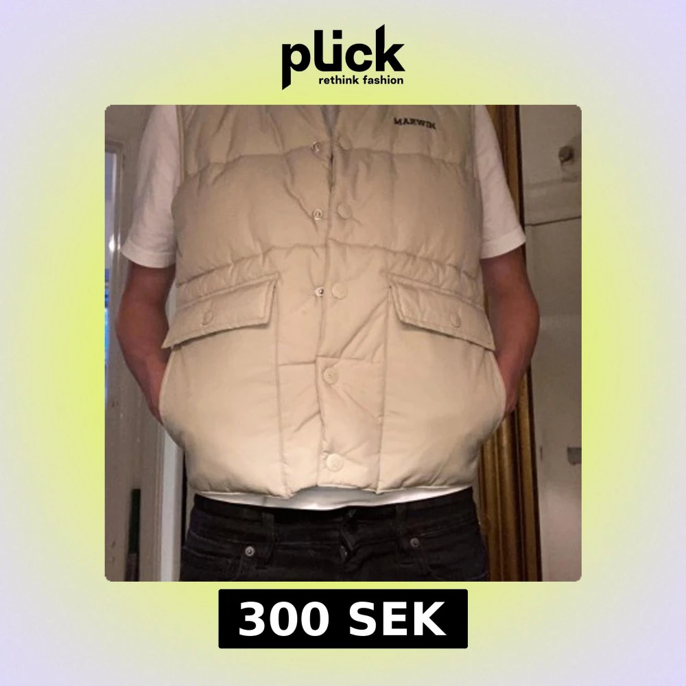 Säljer en beige dunväst från Marwin med hög krage och knäppning framtill. Västen har två stora fickor med lock och tryckknappar. Perfekt för lager-på-lager och enkel att matcha med olika outfits.