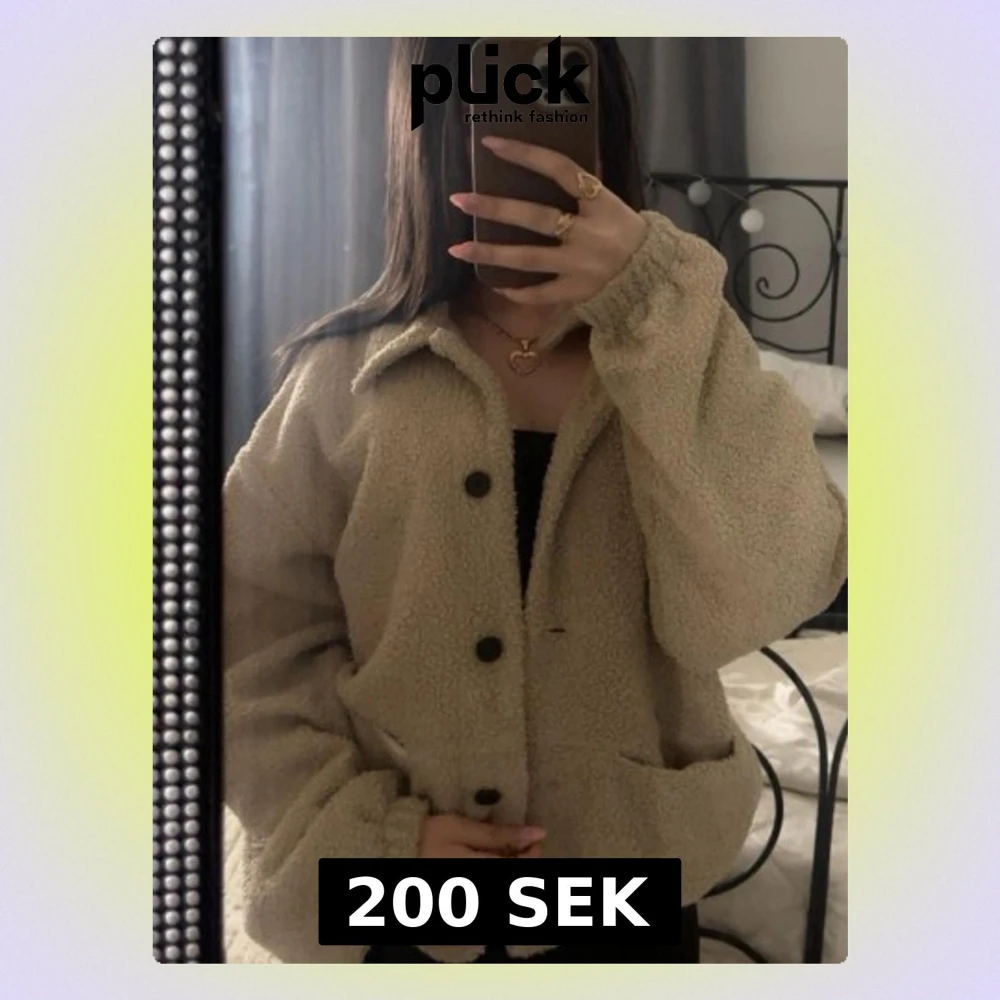 Supermjuk och fluffig beige teddyjacka med stora svarta knappar framtill och två rymliga fickor. Jackan har en avslappnad passform och långa ärmar med resår vid handlederna. Perfekt för dig som vill ha en cozy look under kyliga dagar.