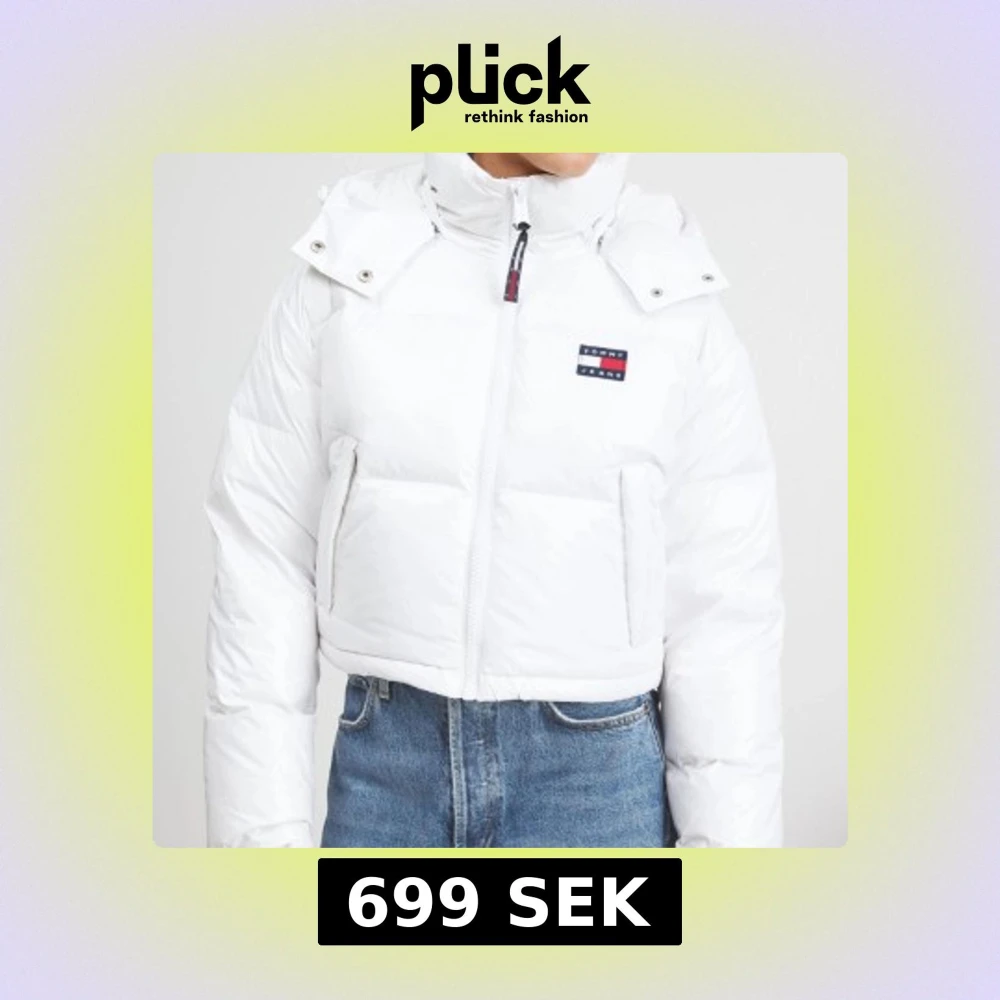 Säljer en snygg vit dunjacka från Tommy Jeans. Jackan är croppad med dragkedja och har en huva. Perfekt för kyliga dagar med sin pufferstil och långa ärmar. Den har en logotyp på bröstet som ger en stilren touch.