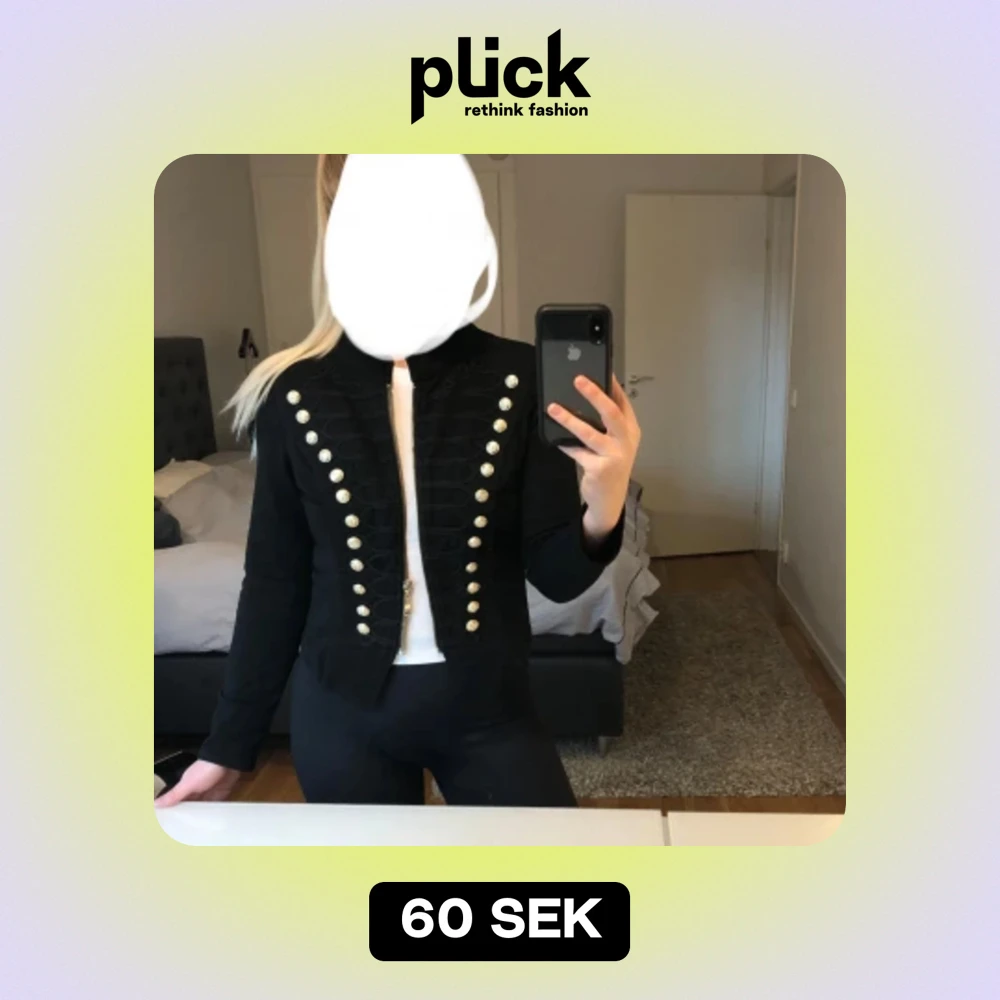 Jacka / tröja med små axelvaddar i. Guldiga knappar och detaljer framtill. Passar xs-m (jag är en S men jackan är stretchig i tyget).🩵