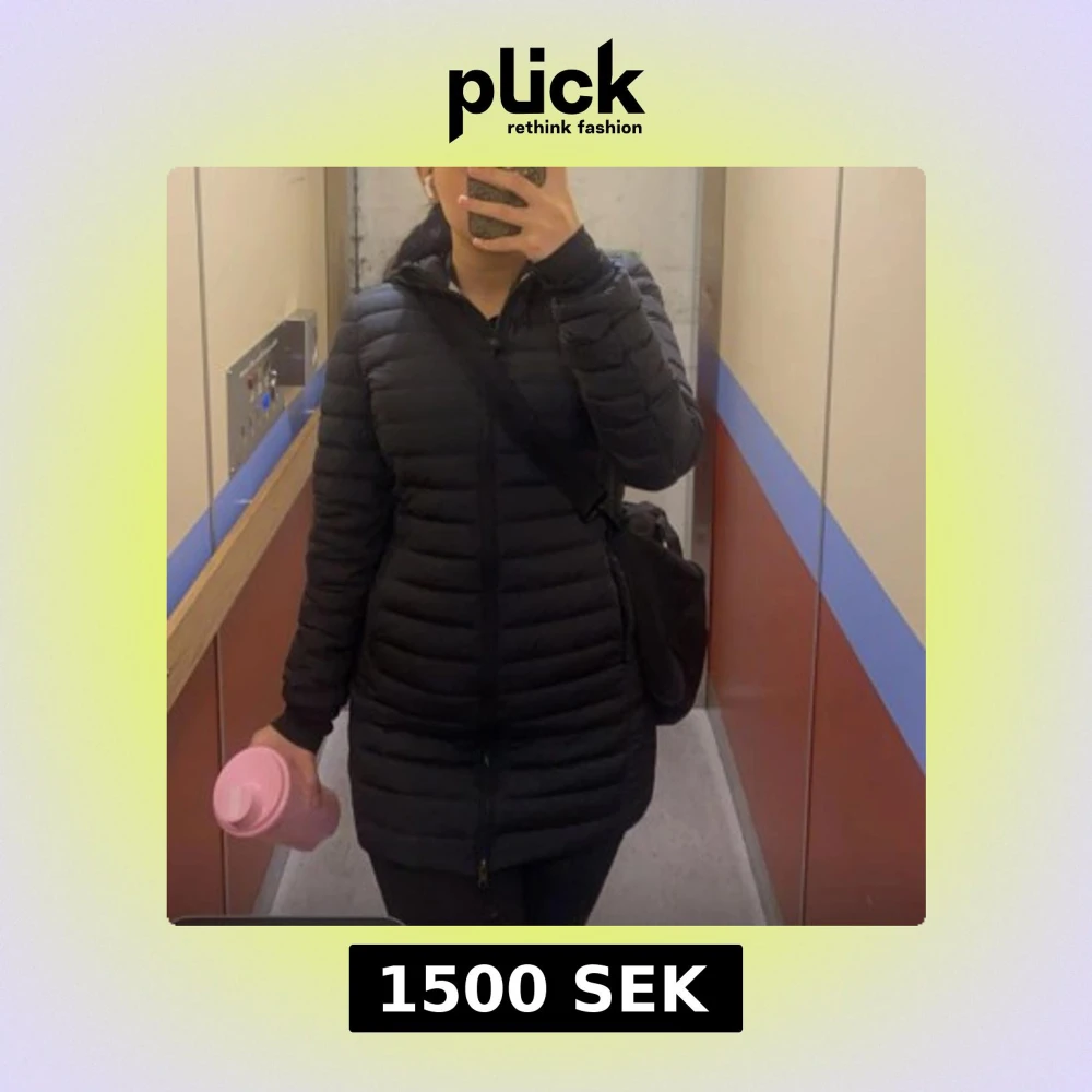 Säljer en svart lång dunjacka med huva och horisontella sömmar. Jackan har dragkedja hela vägen och en clean, stilren look som passar perfekt när det är kallt ute. Snygg passform och enkel att matcha med allt.
