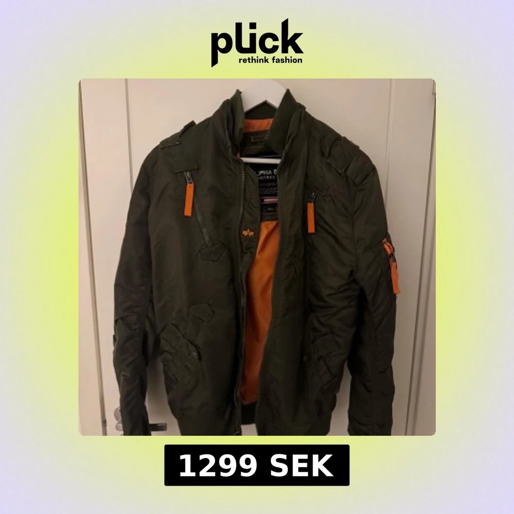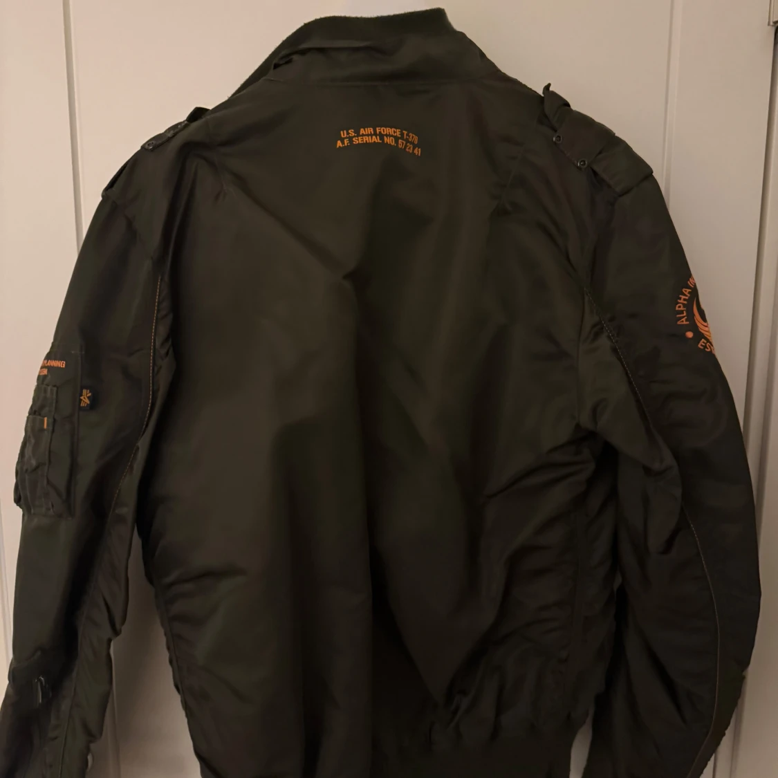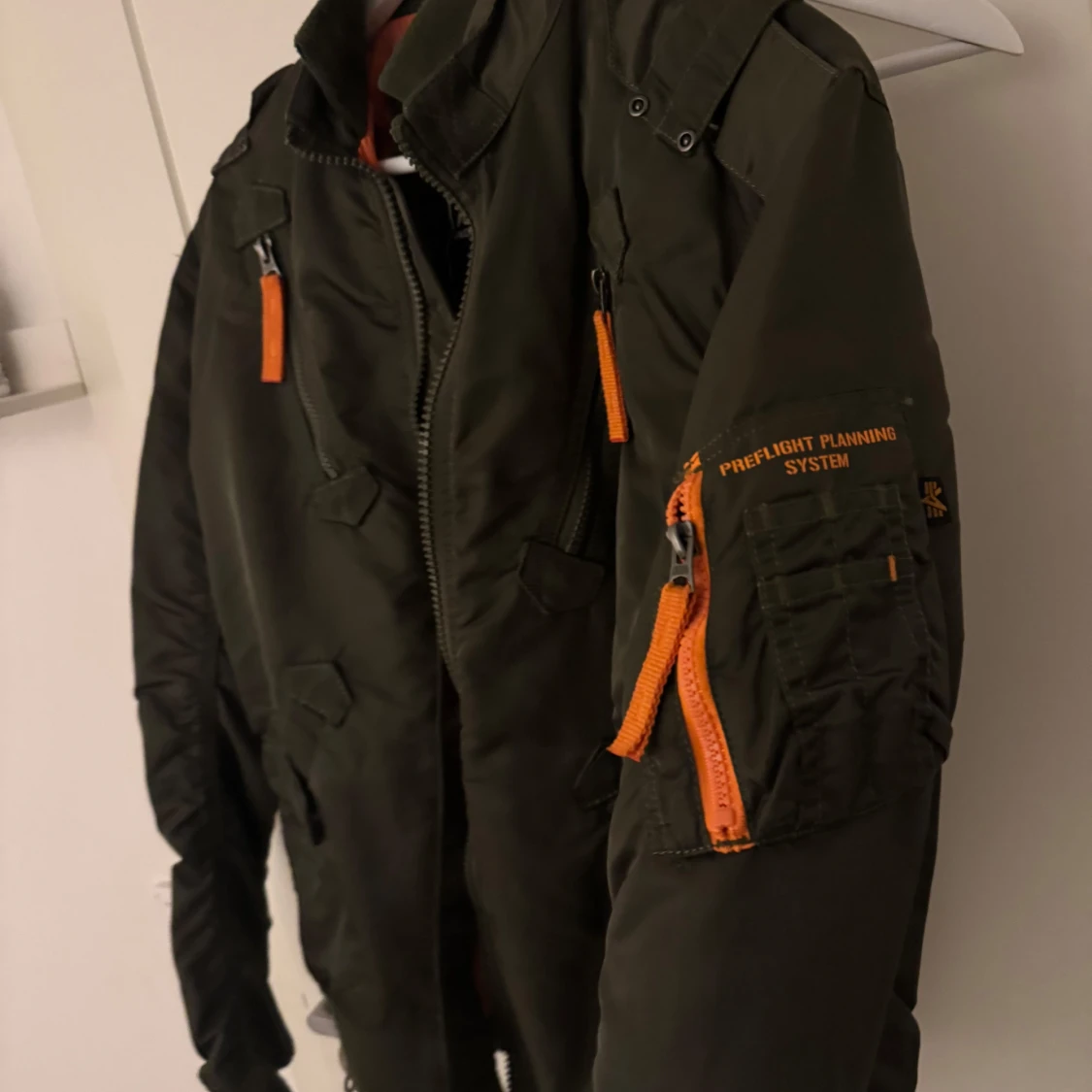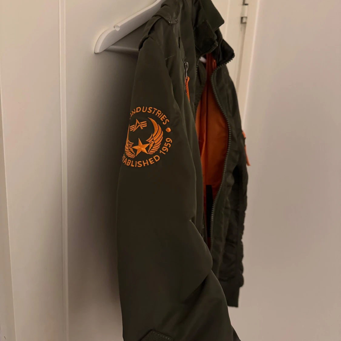 Säljer en grön bomberjacka från Alpha Industries med orange foder och flera dragkedjor. Jackan har broderade detaljer på ärmarna och en klassisk bomberstil. Perfekt för höst och vår. Nypris: 2000-3000kr