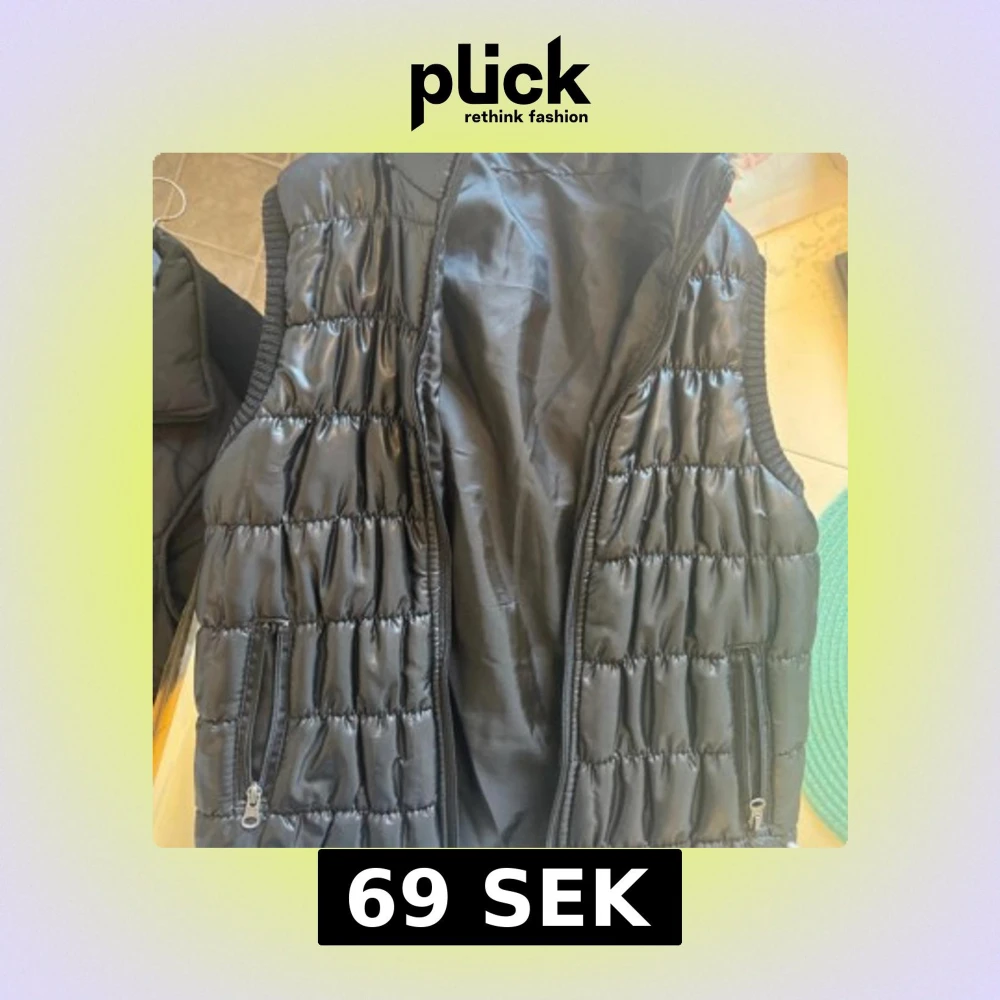 Snygg svart dunväst med quiltad design och glansig yta. Västen har två praktiska fickor med dragkedja och ribbade kanter vid ärmhålen. Perfekt att slänga över en hoodie för extra värme. Stängs med dragkedja framtill. Snabb leverans 📦 kolla gärna på mina andra plagg !