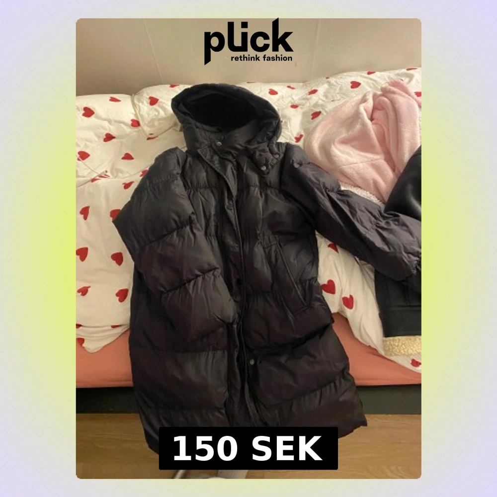 Säljer en svart lång pufferjacka med huva och dragkedja. Jackan är vadderad och har en oversized look, perfekt för kalla dagar. Flera fickor framtill och hög krage som skyddar mot vinden. Snygg och praktisk vinterjacka för dig som vill hålla värmen.