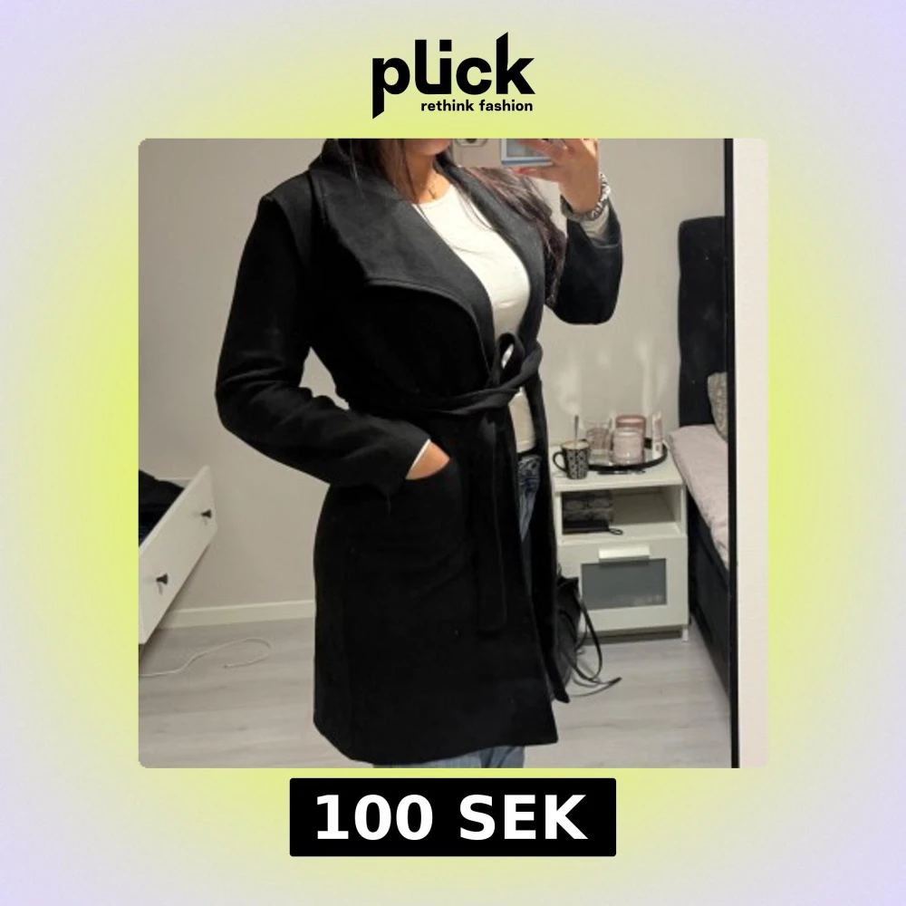 Stilren svart kappa från Shein med knytskärp i midjan och stora fickor. Jackan har en klassisk krage och är långärmad, perfekt för dig som gillar en clean och enkel look. Materialet är mjukt och känns skönt mot kroppen.
