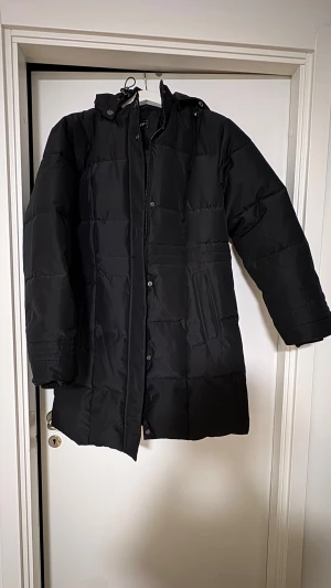 Säljer en svart, längre puffer-jacka som värmer riktigt bra under vintern. Den är lätt, bekväm och har huva samt dragkedja + knappar för extra skydd mot kyla och vind. Fickor på sidorna. Passar perfekt för kalla svenska vintrar. Den är köpt från stadium, är använd väldigt få gånger och är i superbra skick exakt som en ny jacka. ✔ Mycket varm ✔ Lång modell ✔ Huva ✔ Dragkedja + knappar ✔ Fint skick, inga skador eller fläckar ✔️Vattentät Storlek: S Endast använd sparsamt. Kan hämtas eller skickas