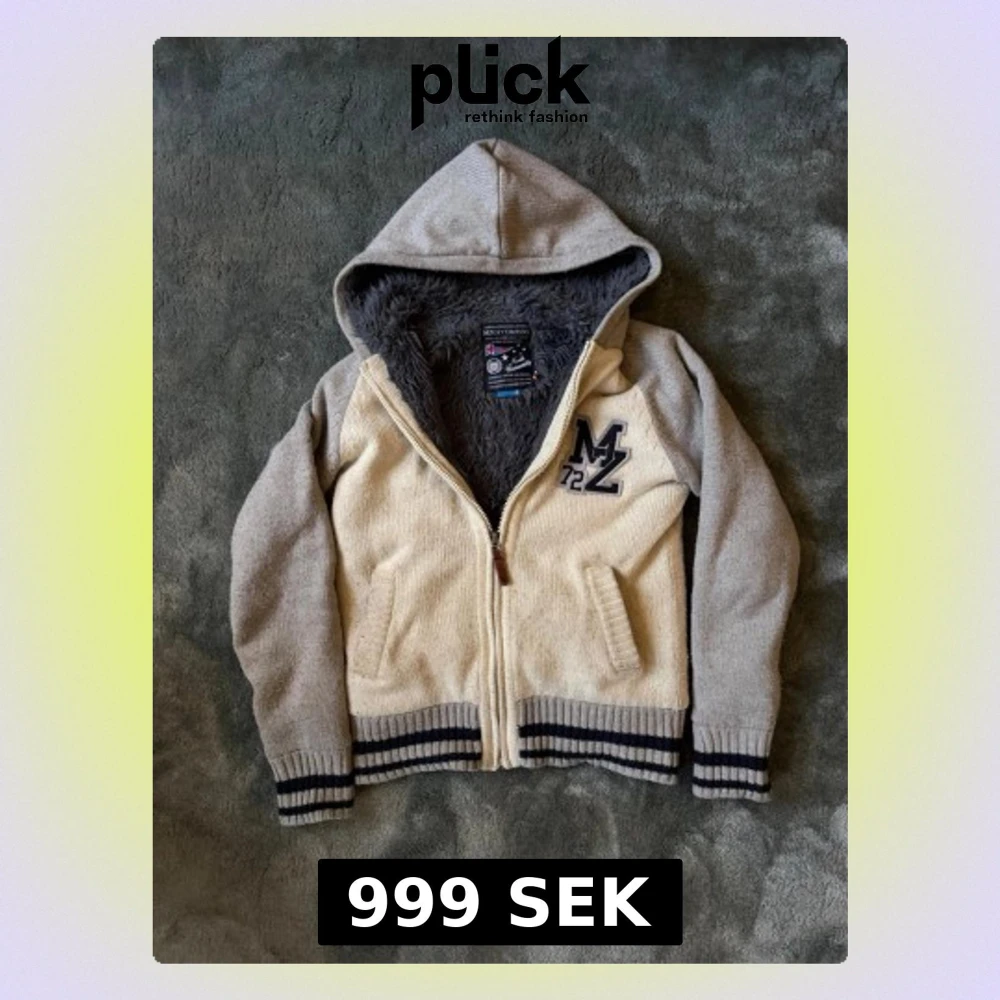 Vintage teddyjacka i beige med grå ärmar och mörkgrått fluffigt foder. Riktigt fet och varm med huva, dragkedja och två fickor. Broderad MZ 72-patch och ribbstickade muddar med svarta ränder. Ger vintage Hollister vibe.