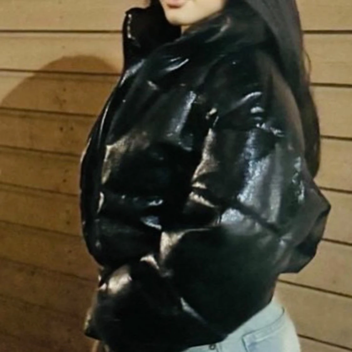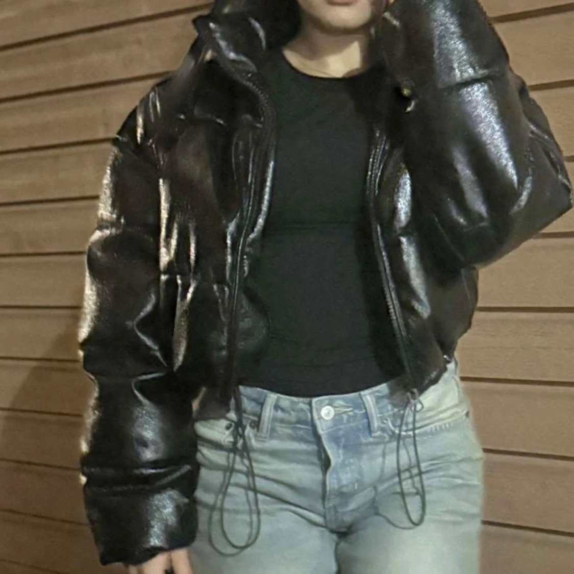 Snygg svart pufferjacka med glansig yta. Jackan har en dragkedja framtill och långa ärmar. Perfekt för att hålla värmen med stil.