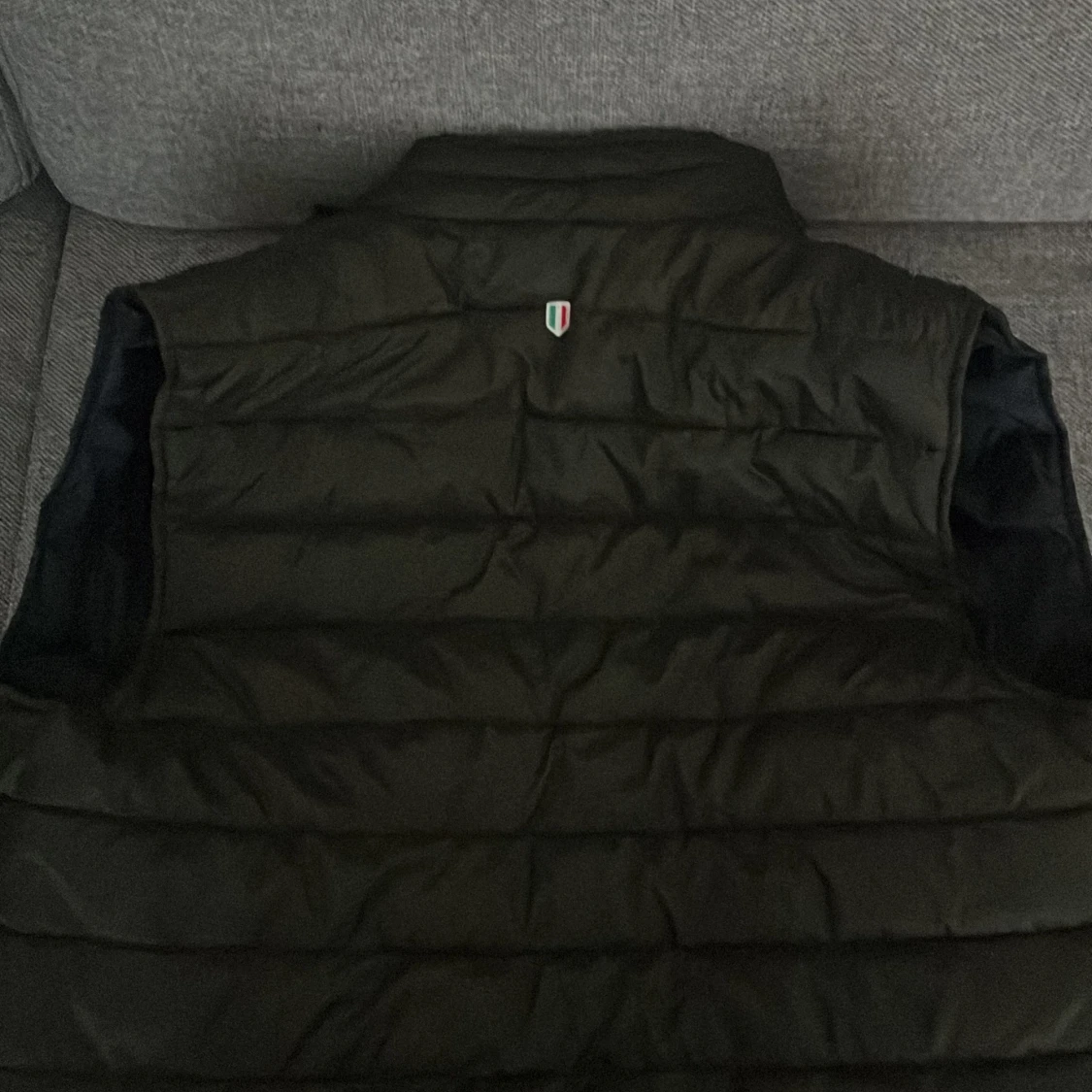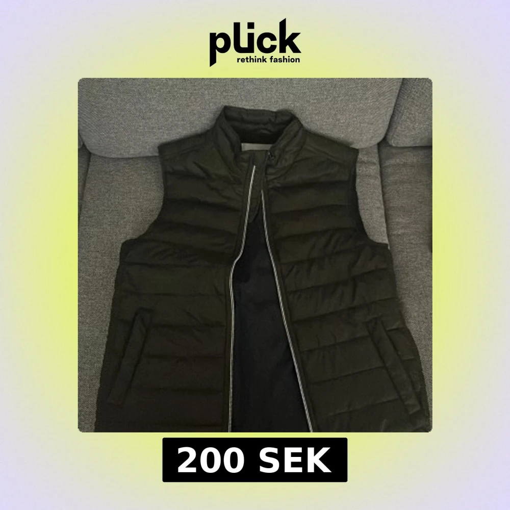 Säljer en grön dunväst med ståkrage och horisontella quiltade sömmar. Västen har dragkedja framtill och två fickor på sidorna. På ryggen sitter en liten detalj. Perfekt för lager-på-lager-stil under kyliga dagar.