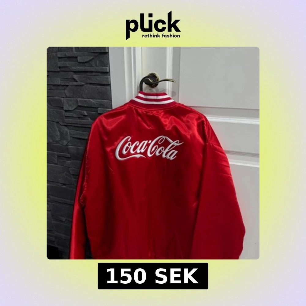 Snygg röd bomberjacka från Coca-Cola med vit logga broderad på både bröstet och ryggen. Jackan har vita detaljer vid fickorna och knapparna, samt en randig ribbad krage i rött och vitt. Materialet är glansigt och känns riktigt retro och sportigt.