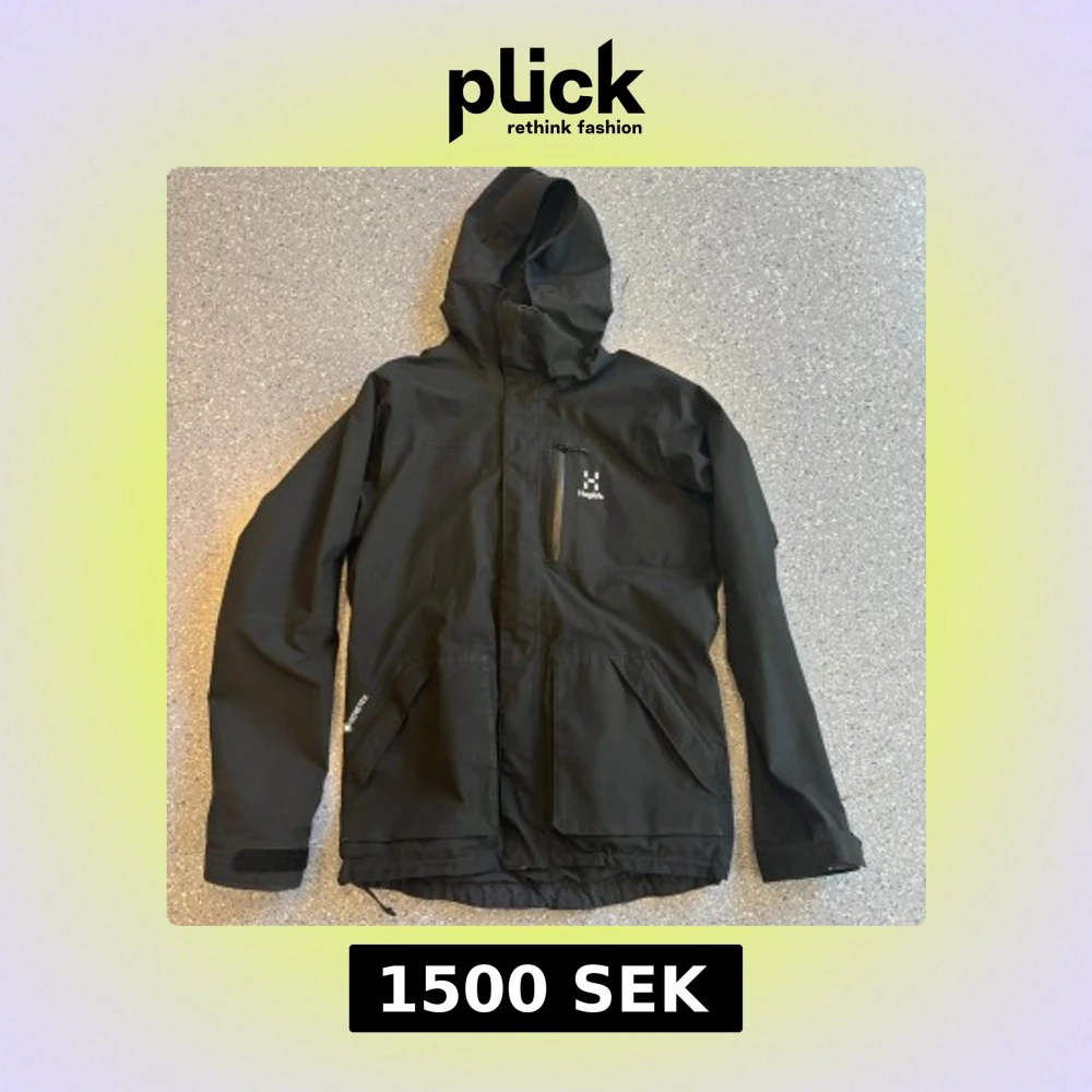 Säljer en svart vindjacka från Haglöfs med huva och dragkedja. Jackan har en bröstficka med dragkedja och två stora fickor framtill. Tillverkad i Gore-Tex-material för extra skydd mot väder och vind.