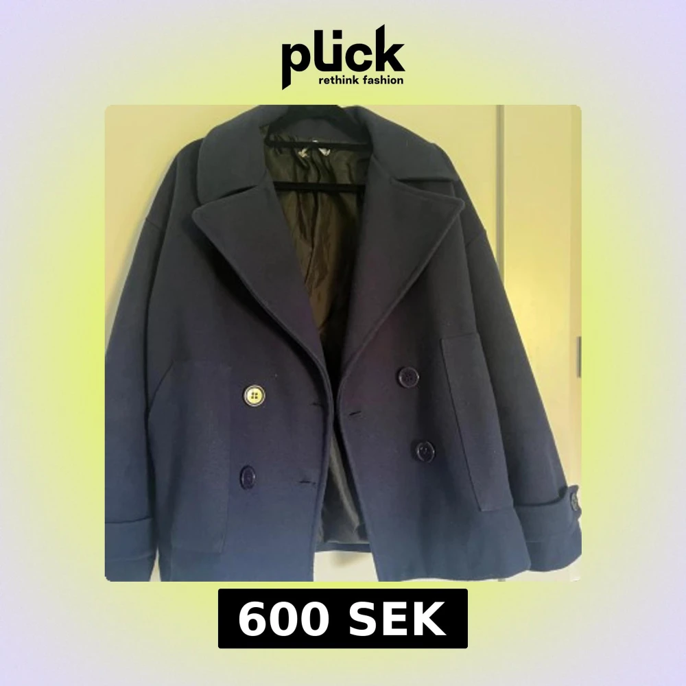 Säljer en mörkblå kappa med stora slag och dubbelknäppning. Jackan har två stora fickor framtill och dekorativa knappar vid ärmsluten. Oversized passform och fodrad insida. Perfekt för kyligare dagar.