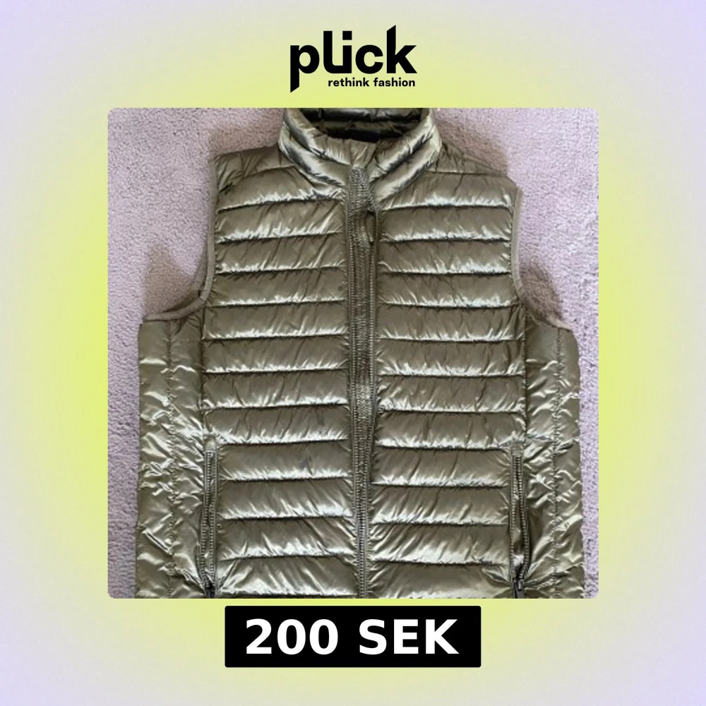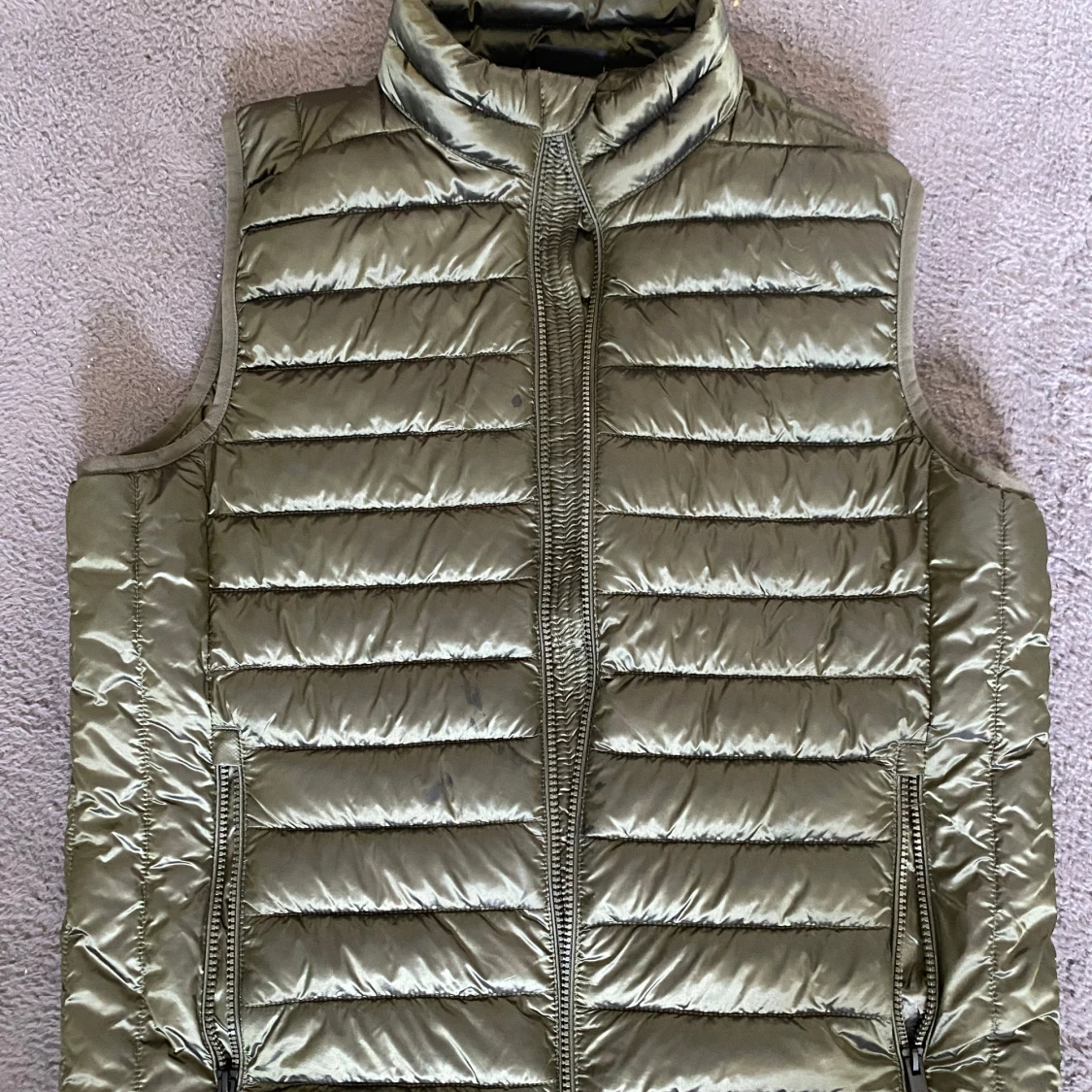 Snygg olivgrön dunväst med hög krage och horisontella sömmar. Västen har dragkedja framtill och två fickor med dragkedja. Perfekt att bära över en hoodie eller tröja för extra värme.