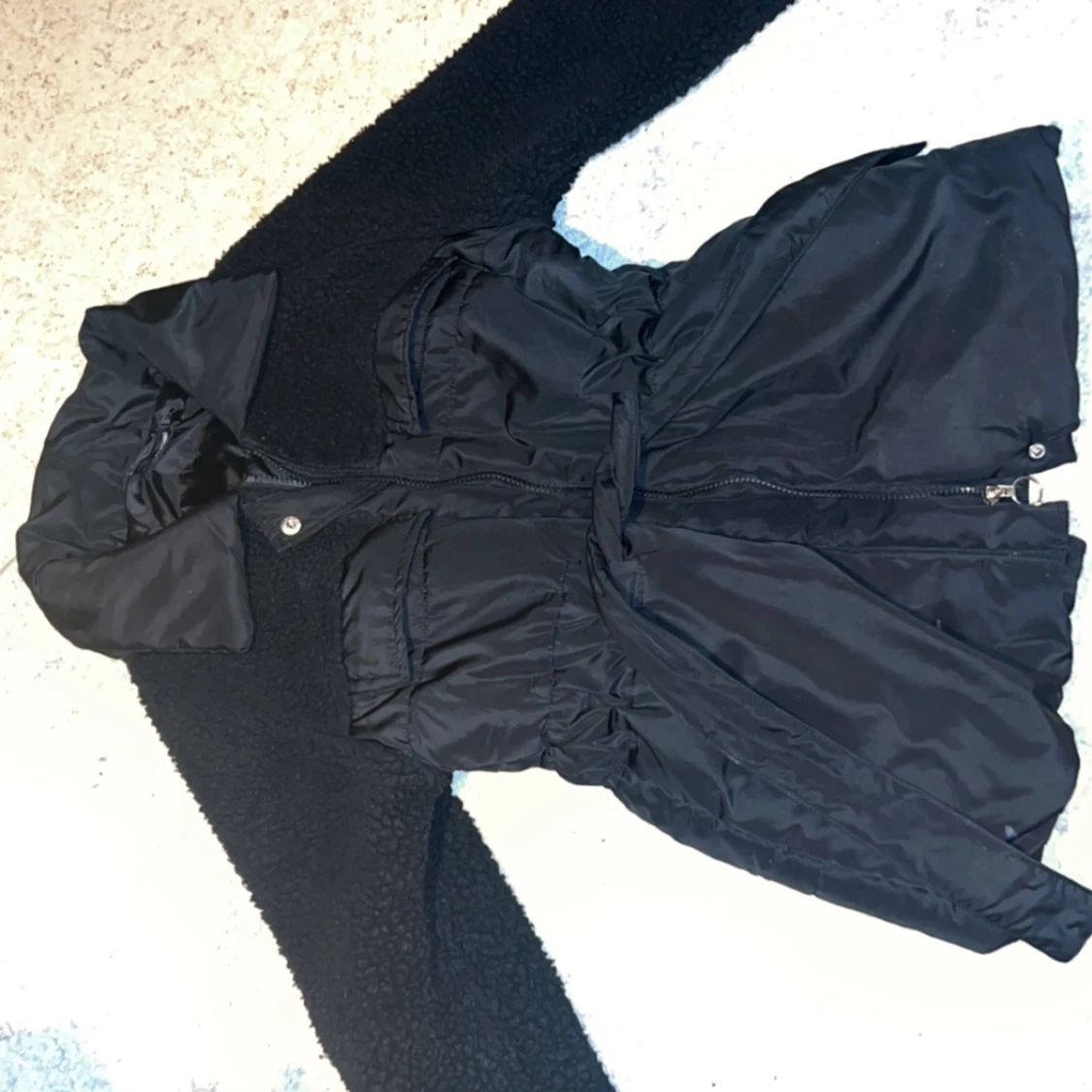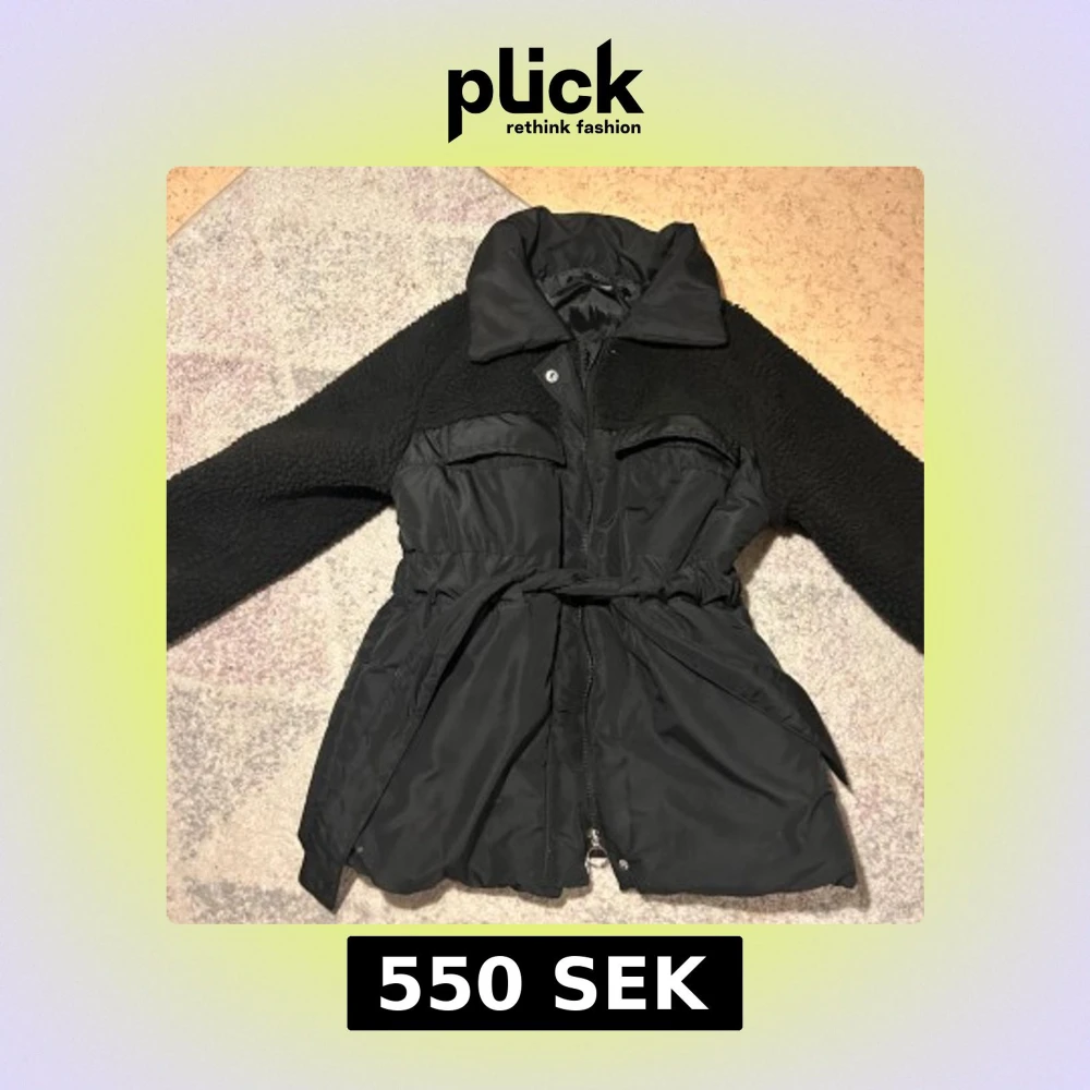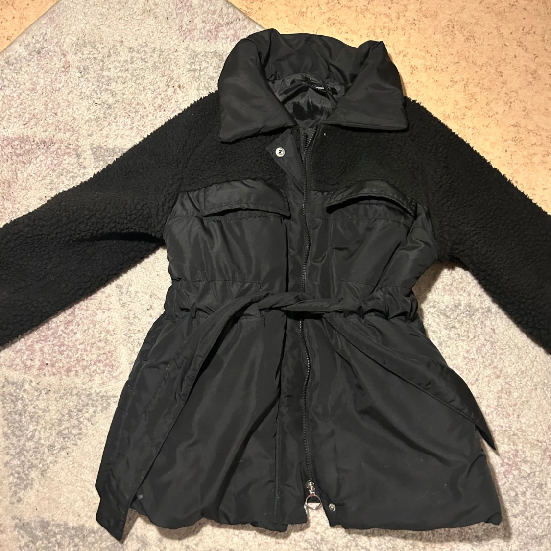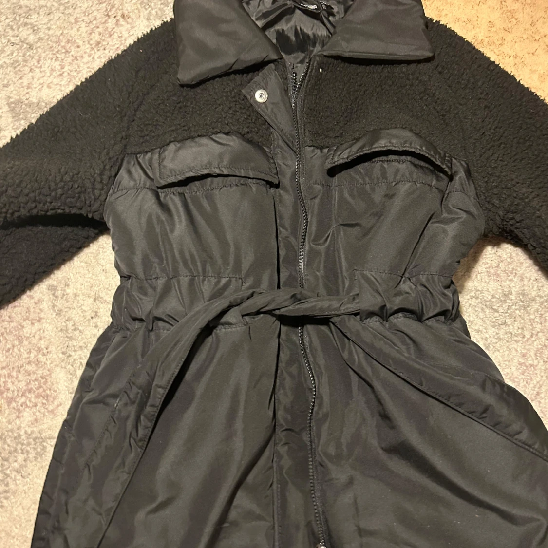 Snygg svart teddyjacka med bälte i midjan och dragkedja framtill. Jackan har långa ärmar och en mysig krage. Perfekt för kyligare dagar när du vill hålla stilen.