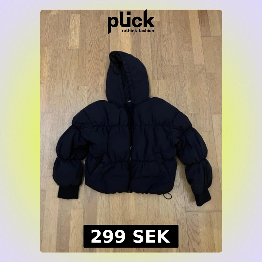 Svart pufferjacka från Divided i storlek S. Jackan har en stor huva, dragkedja framtill och puffiga, quiltade sektioner på både kropp och ärmar. Muddar vid ärmslut och justerbar nederkant med snörning. Perfekt för kalla dagar.
