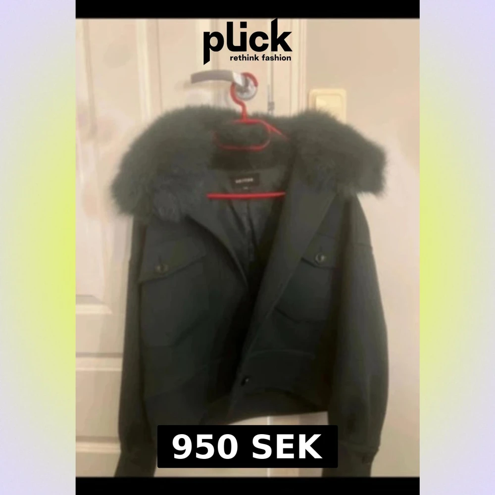 Säljer en mörkgrön pälsjacka från Meotine med fluffig krage i fuskpäls. Jackan är croppad med stora fickor framtill och knäpps med knappar.
