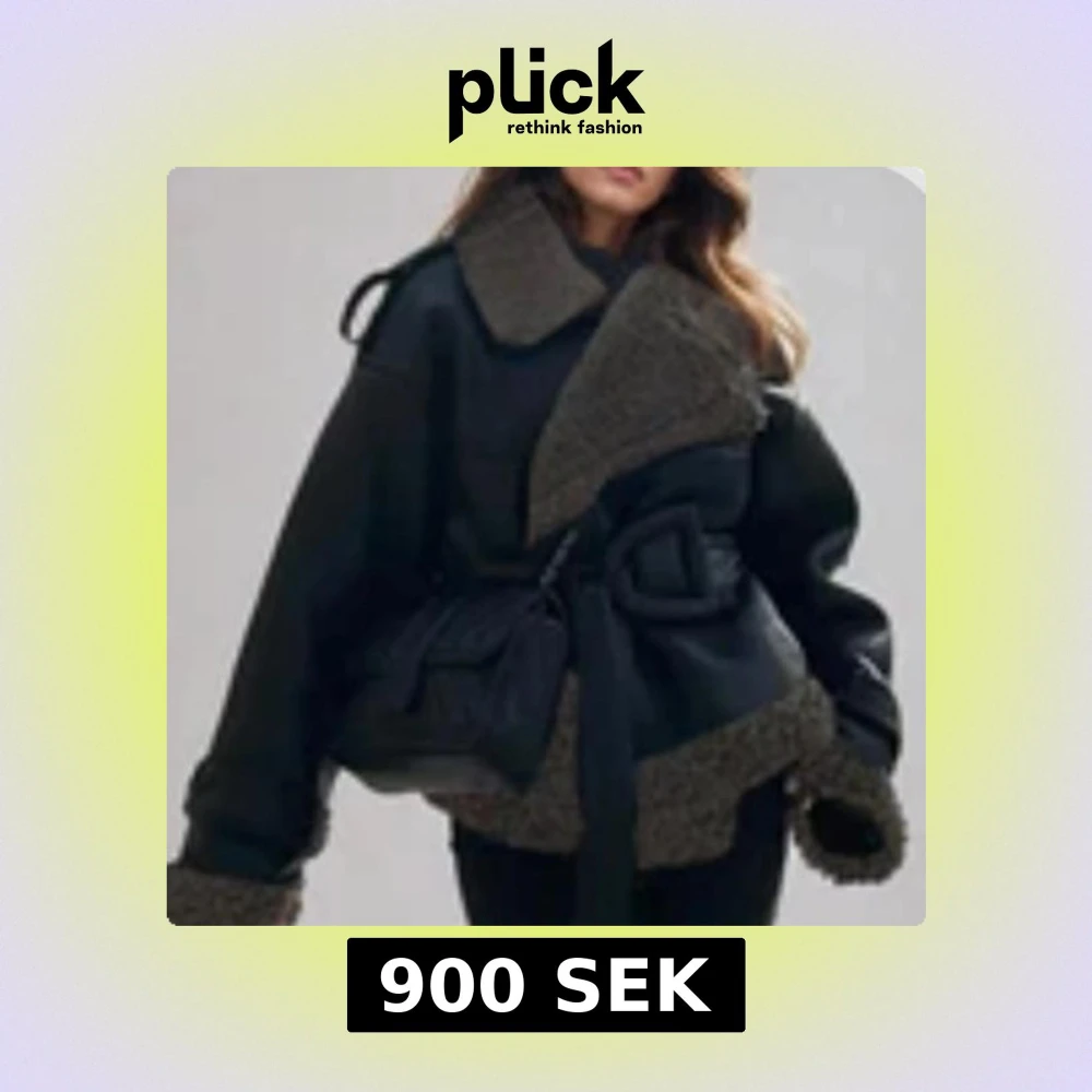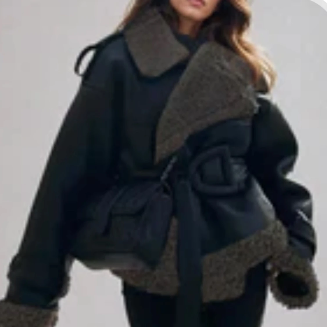 Snygg svart pälsjacka med stora slag och bälte i midjan. Jackan har en oversized passform och är perfekt för kyliga dagar. Den har långa ärmar och en mysig pälsdetalj på insidan och kanterna.