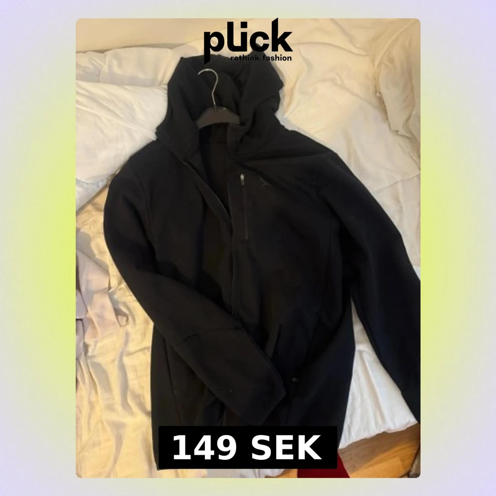 Säljer en svart vindjacka med huva och dragkedja framtill. Jackan har en enkel och stilren design med fickor och lång ärm. Perfekt för dig som vill ha en lätt och smidig jacka till vardags. Passar till många olika stilar.