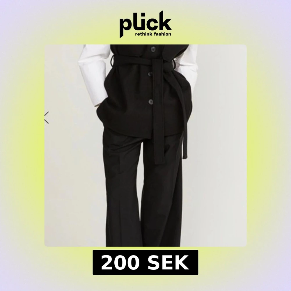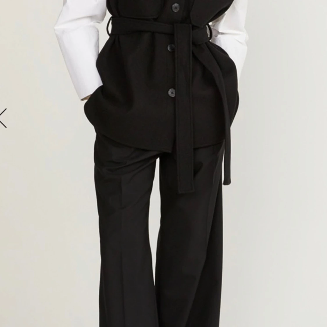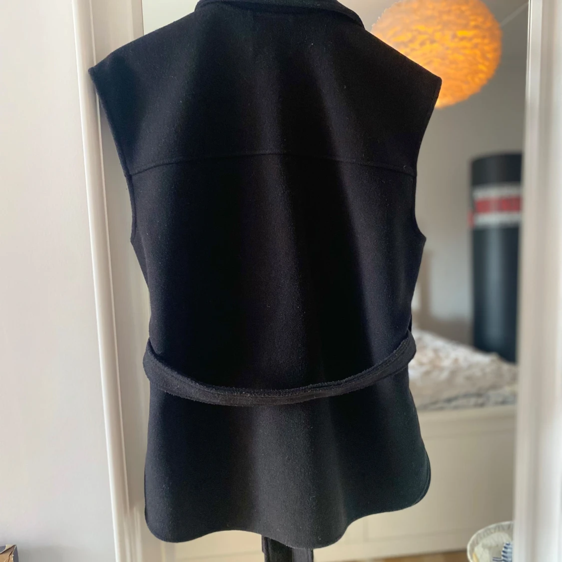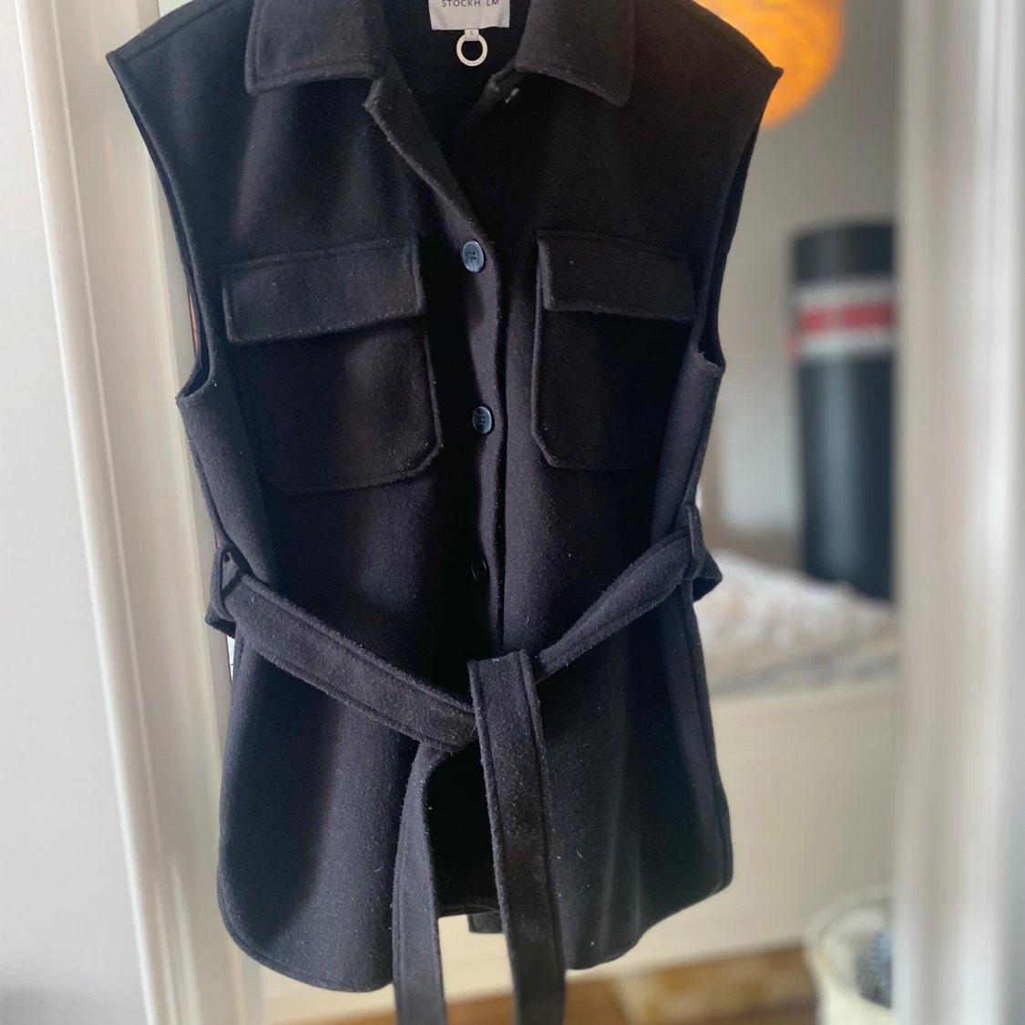 Stilren svart väst från STOCKH LM i ull med knappar framtill, två bröstfickor och tillhörande bälte i midjan. Västen har klassisk krage och en rak, något loose passform. Perfekt att slänga över en skjorta för en clean look.