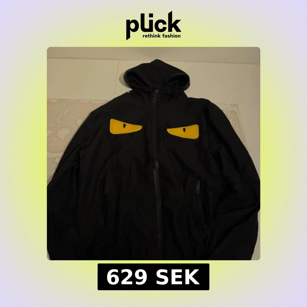 Svart vindjacka med huva och dragkedja framtill. Två gula ögon-detaljer på bröstet ger jackan en unik look. Fickor med dragkedja på sidorna. Perfekt för dig som vill sticka ut.