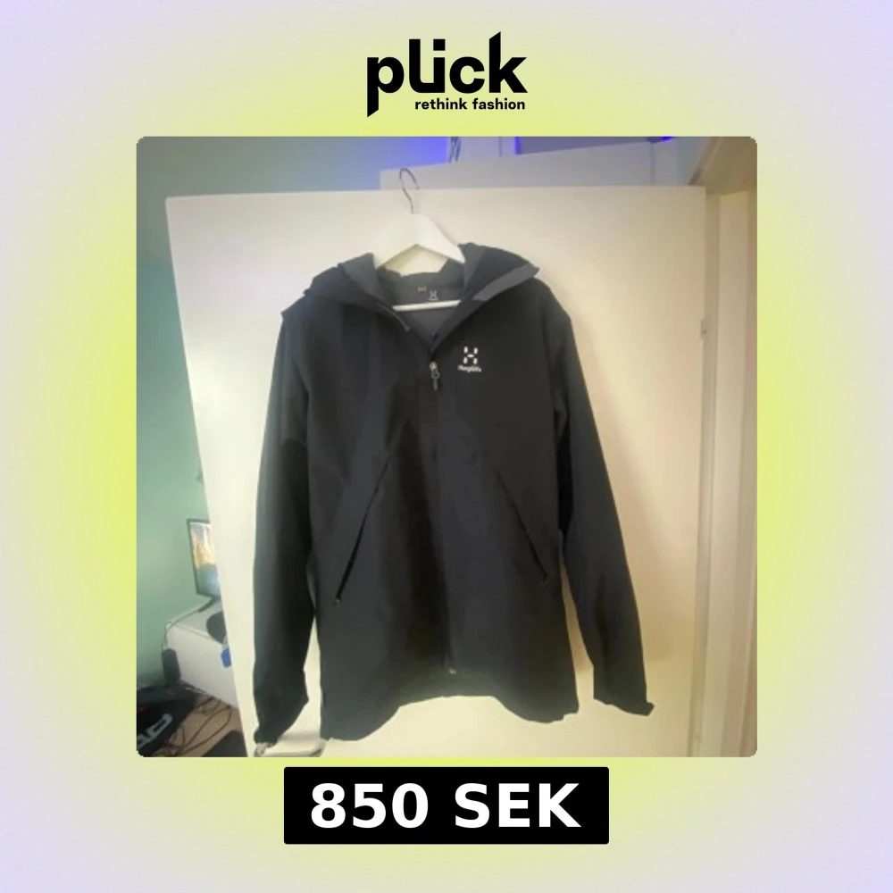 Helt ny svart skaljacka från Haglöfs med justerbar huva och dragkedja framtill. Jackan har två sidofickor med dragkedja och diskret logga på bröstet. Perfekt för utomhusaktiviteter och skyddar mot vind och regn.