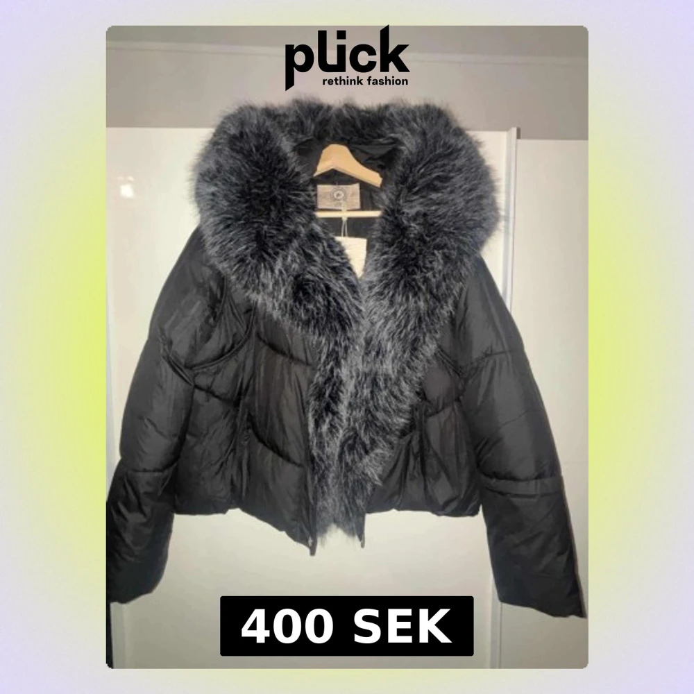 Säljer en svart pufferjacka från Rock and Blue med stor fluffig konstpäls i grått runt kragen. Jackan är croppad och har en riktigt snygg oversized look. Perfekt för kalla dagar när du vill vara både varm och stilren. Inte Använd någon gång