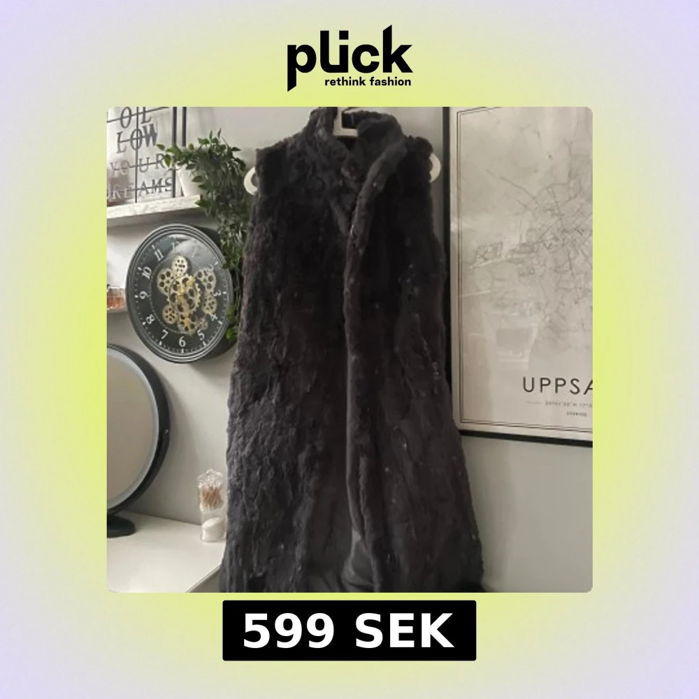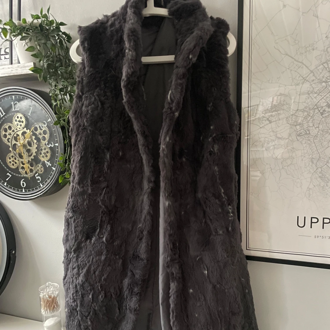 Säljer en stilren lång mörkgrå pälsväst som är perfekt för kyliga dagar. Västen har en mjuk och fluffig textur som ger en lyxig känsla. Den är ärmlös och har en klassisk design som passar till många olika outfits. Står inte storlek på men sitter som en S/M