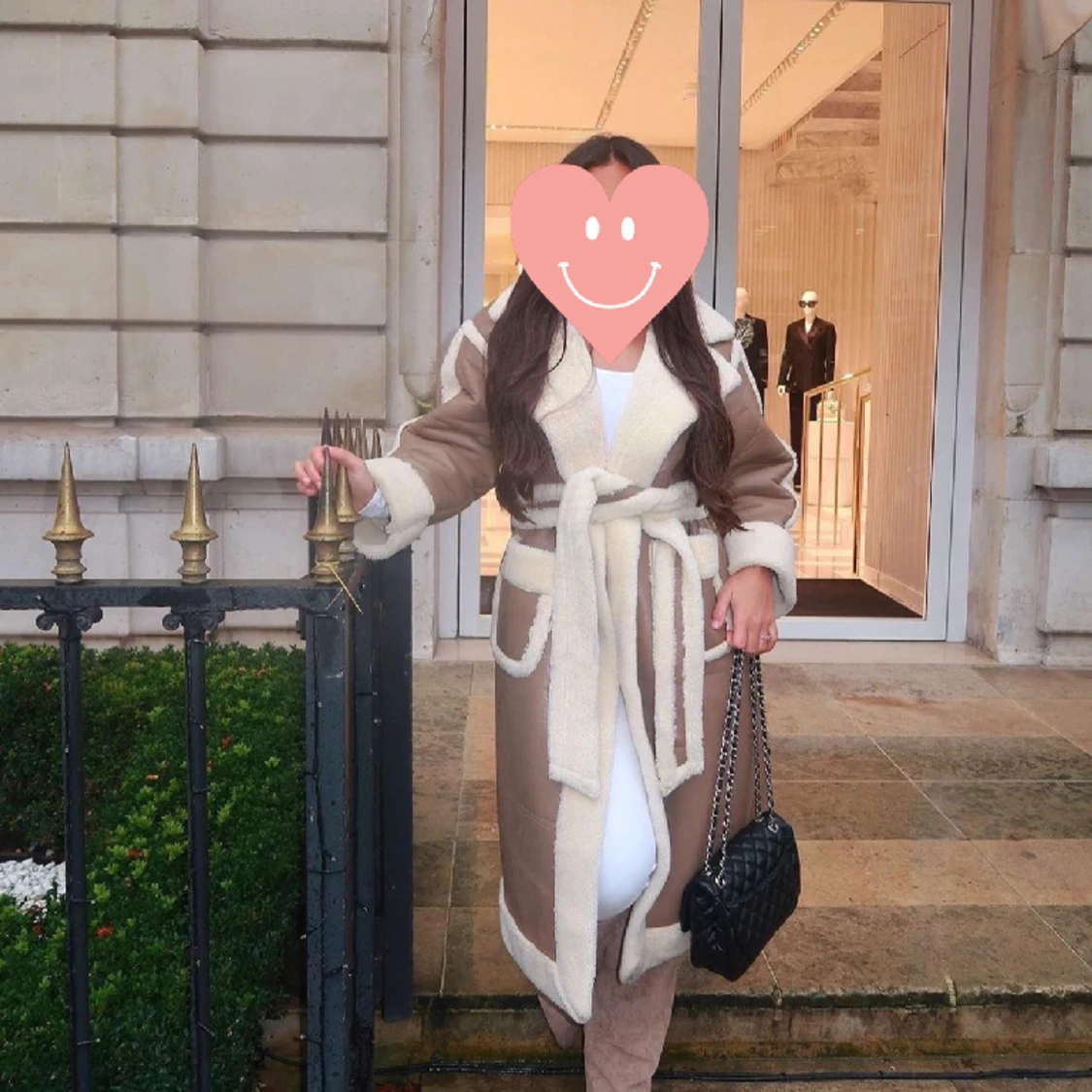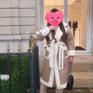 Lång fårskinnsrock med knytband med överdimensionerad skärning, lång, fårskinnsinredning, överdimensionerat midjebälte, slitsfickor. Använd 1-2 gånger
