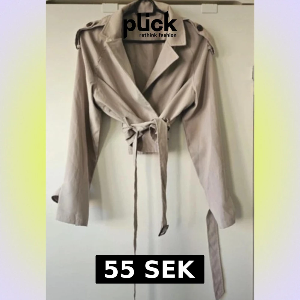 Snygg croppad trenchcoat i beige med klassisk krage, axelklaffar och långa ärmar. Jackan har ett omlottband i midjan som knyts och ger en cool siluett. Perfekt att styla med jeans eller kjol för en trendig look.