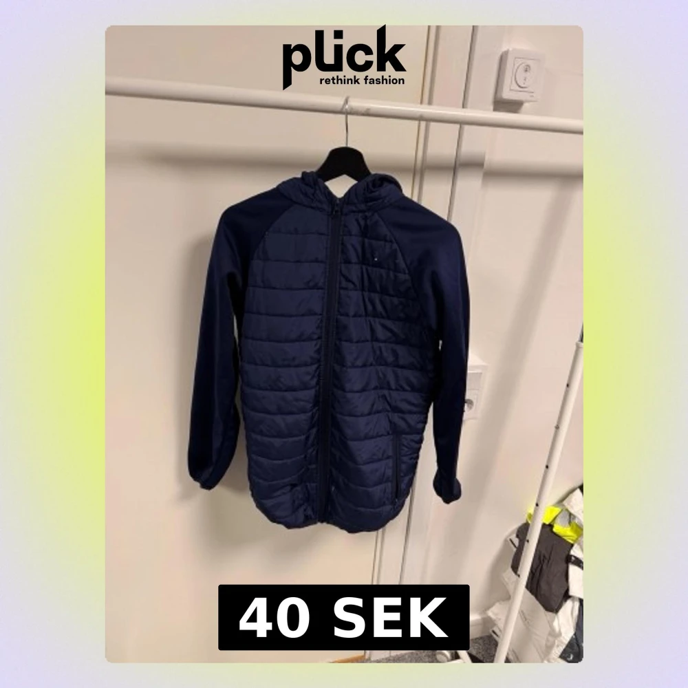Säljer en mörkblå pufferjacka med huva och dragkedja framtill. Jackan har quiltad framsida och släta ärmar, samt två fickor med dragkedja. Perfekt för kyliga dagar och enkel att matcha med olika outfits.