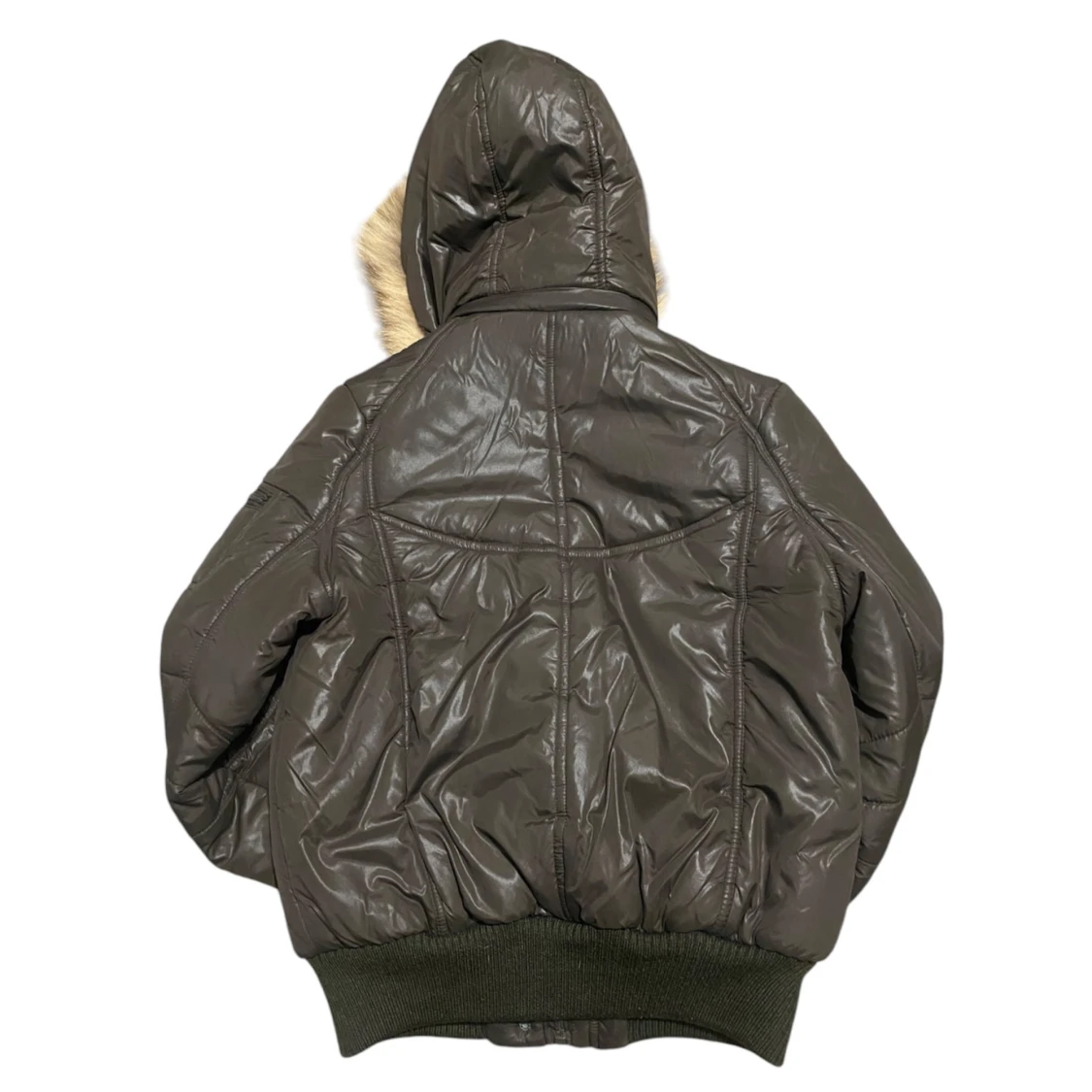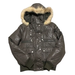 Fin brun pufferjacka med pälskrage. Jackan har flera fickor med dragkedja och knappar. Väldigt bra skick förutom lite missfärgning på dragkedjorna (se sista bilder) som knappts syns men är alltid bra att nämna. Jätte bekväm att ha på sig! Den är väldigt liten i storlek, står L men känns mer som en S. Skriv vid frågor❕