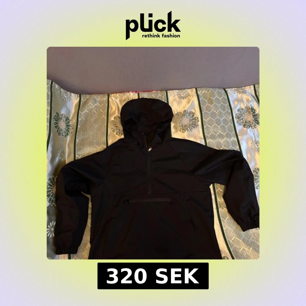 Svart vindjacka med huva och half zip framtill. Jackan har elastiska muddar vid ärmslut och en stor ficka med dragkedja på magen. Perfekt för blåsiga dagar och har en clean, sportig look som funkar till streetwear.