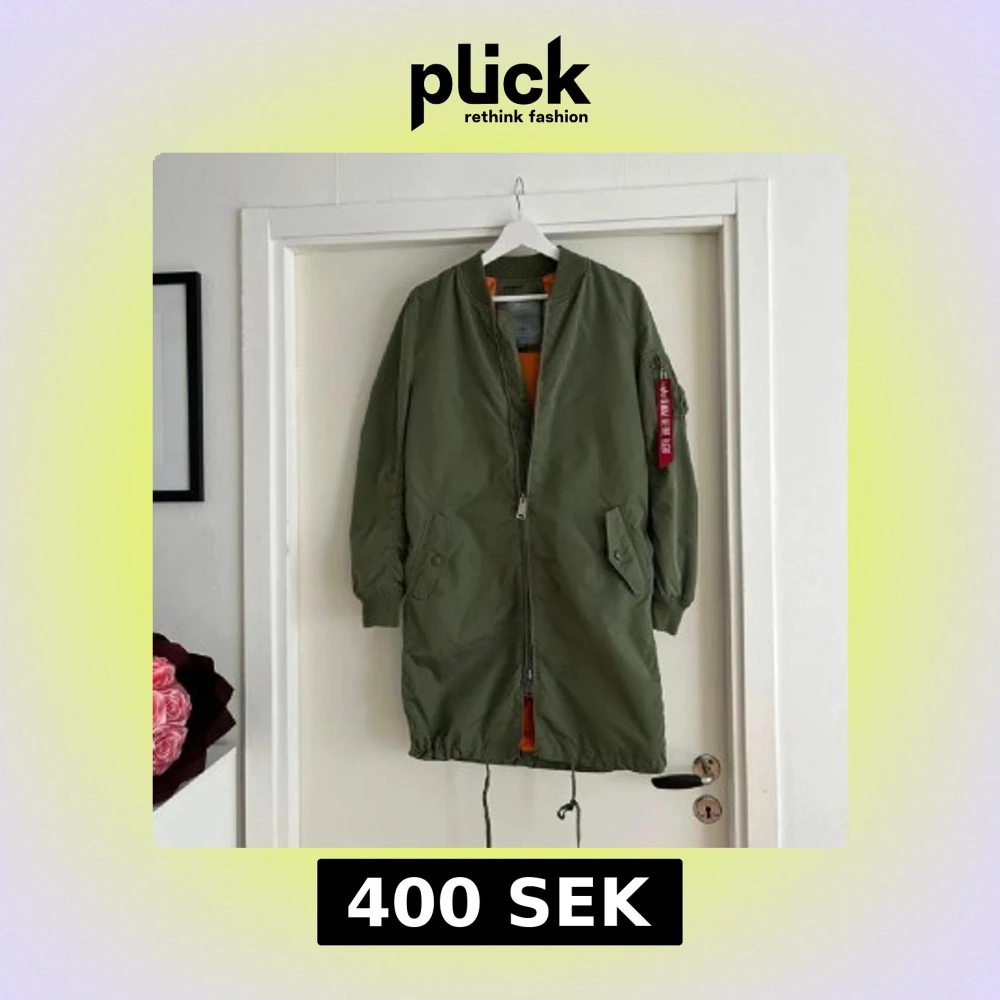 Säljer en olivgrön lång bomberjacka från Alpha Industries med orange foder, dragkedja framtill och snörning i nederkant. Jackan har ribbade muddar, fickor med lock och klassisk röd tag på ärmen. Perfekt för dig som gillar streetstyle och vill sticka ut.