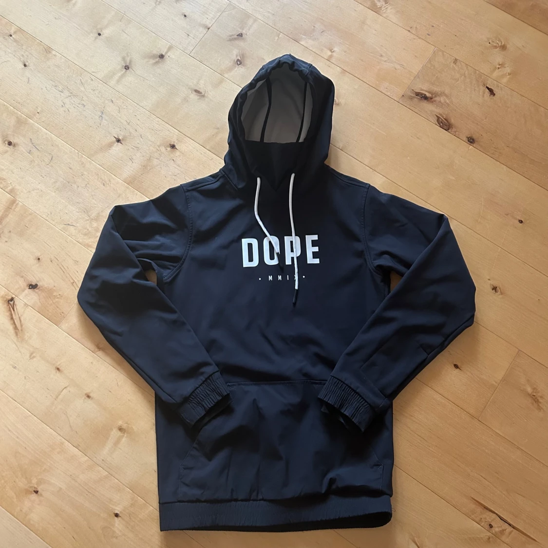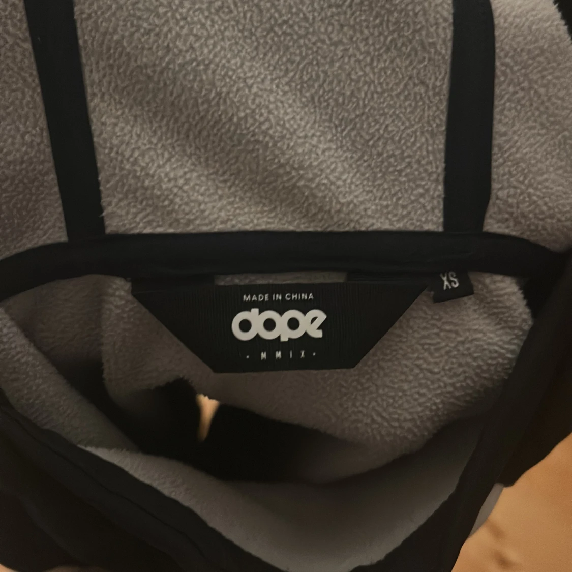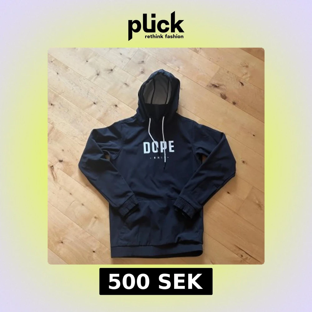 Säljer en svart hoodie från Dope med vit text på bröstet. Storlek XS men passar även S. Tröjan har en justerbar huva med vita snören och en stor ficka framtill. Perfekt för en avslappnad stil.