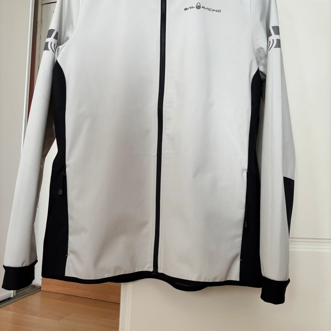 Snygg vit och svart vindjacka från Sail Racing med dragkedja framtill och på fickor. Jackan har lång ärm, sportig design och tryckt logga på ärmen. Perfekt för dig som gillar stilren och funktionell ytterjacka. Jackan är liten i storleken.