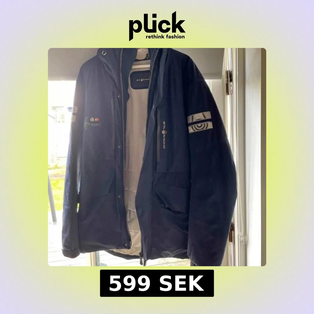 Säljer en mörkblå pufferjacka från Sail Racing med huva och snygga reflexdetaljer på ärmarna. Jackan har dragkedja, snörning vid huvan och flera praktiska fickor. Insidan är ljusgrå och quiltad för extra värme. Perfekt för kalla dagar och stilren look. Klistret på fickorna är lite slitna, annars är jackan i bra skick.