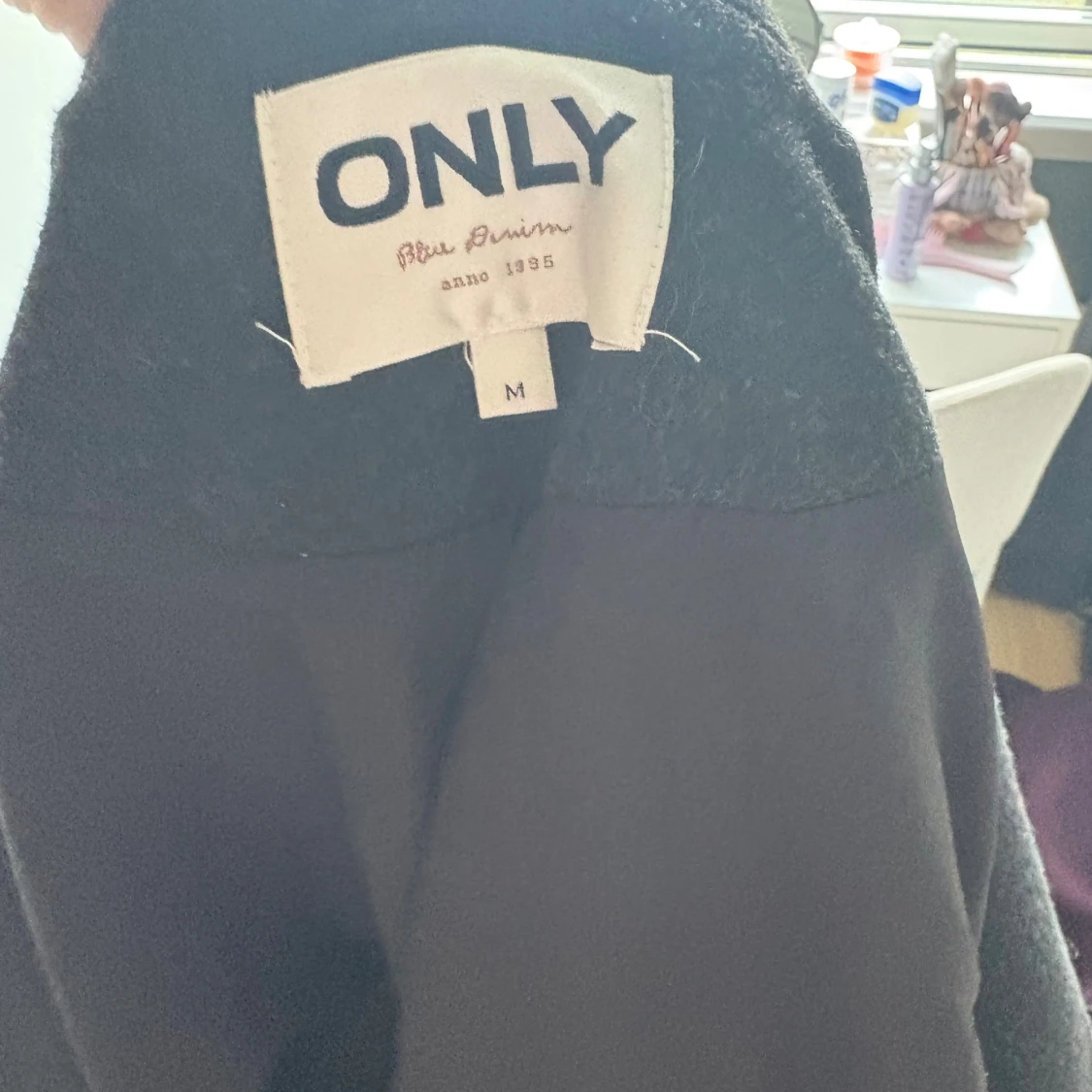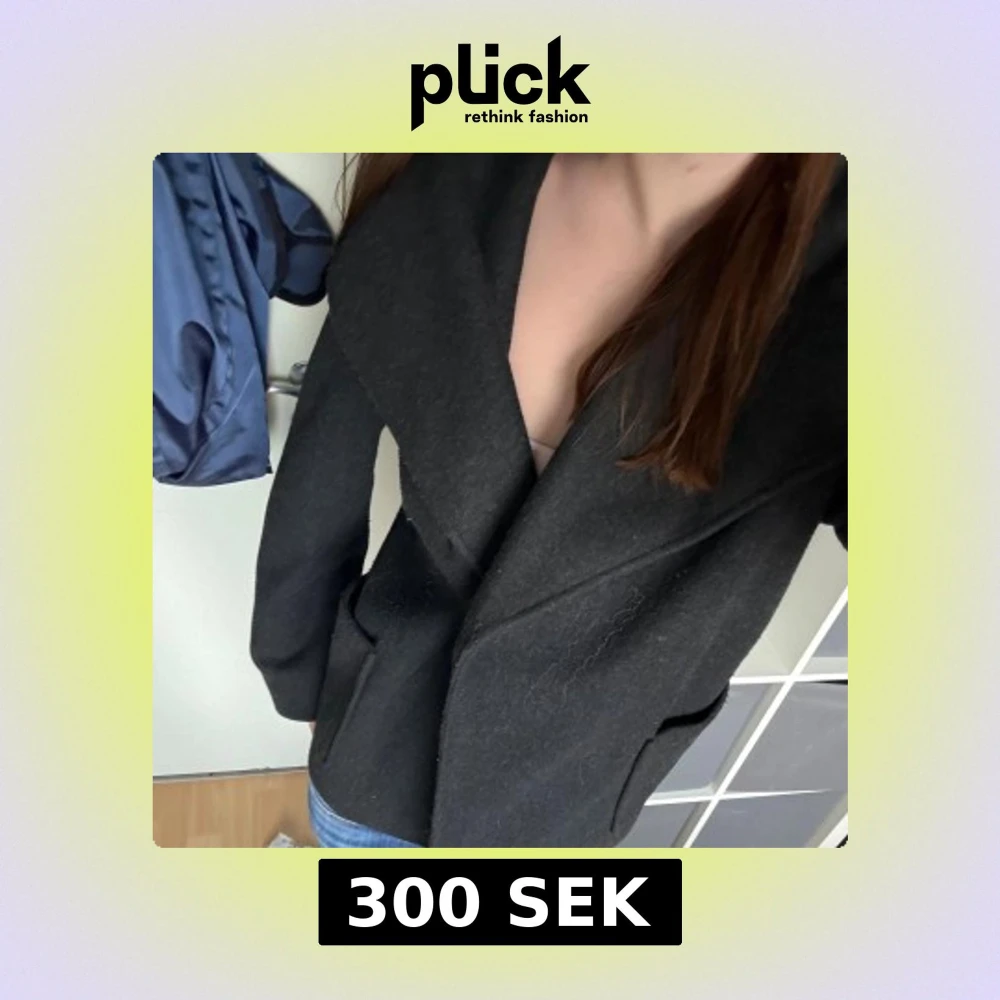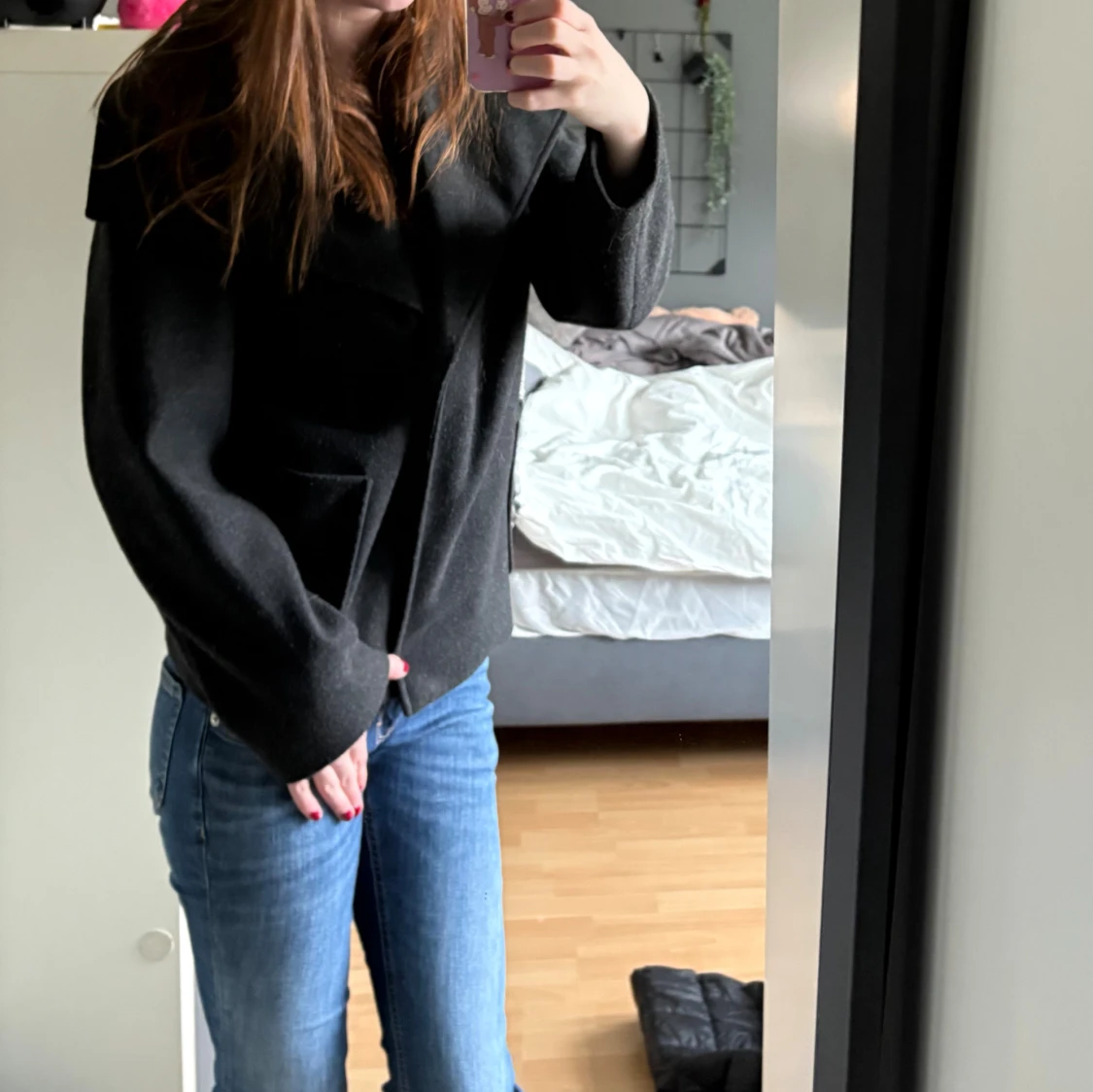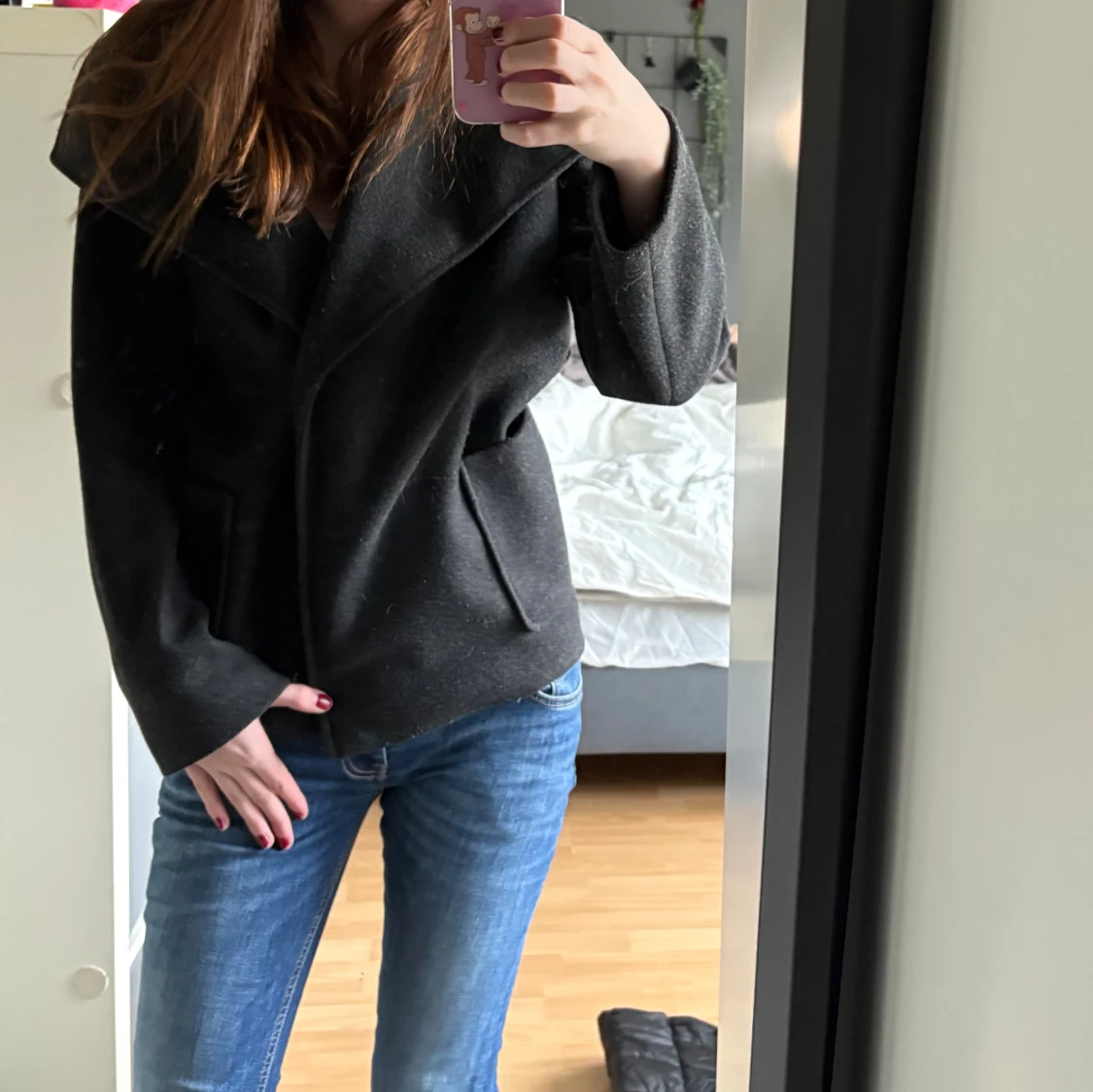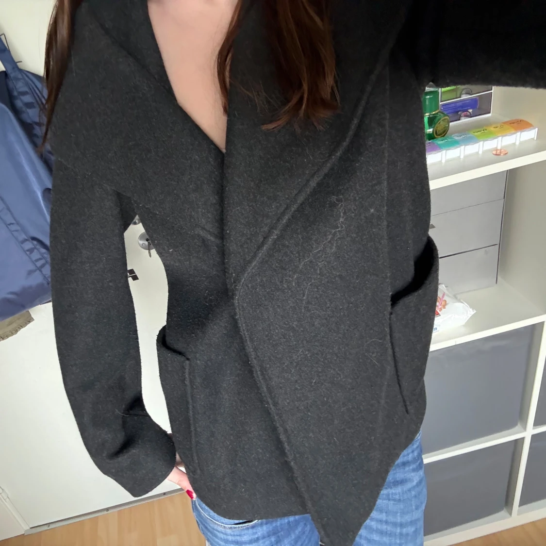 Snygg svart kappa med bred krage och omlott-design. Jackan har två stora fickor framtill och en stilren, lite loose passform. Perfekt för dig som gillar minimalistisk stil och vill ha något som funkar till jeans eller dressat. Materialet känns som ull och ger en mjuk känsla. Perfekt till hösten/ tidig vinter och knäpps med knapp. Fanns snöre men borttappat 💘💘Storlek M men passar även mig med S/Xs. Nypris 749.