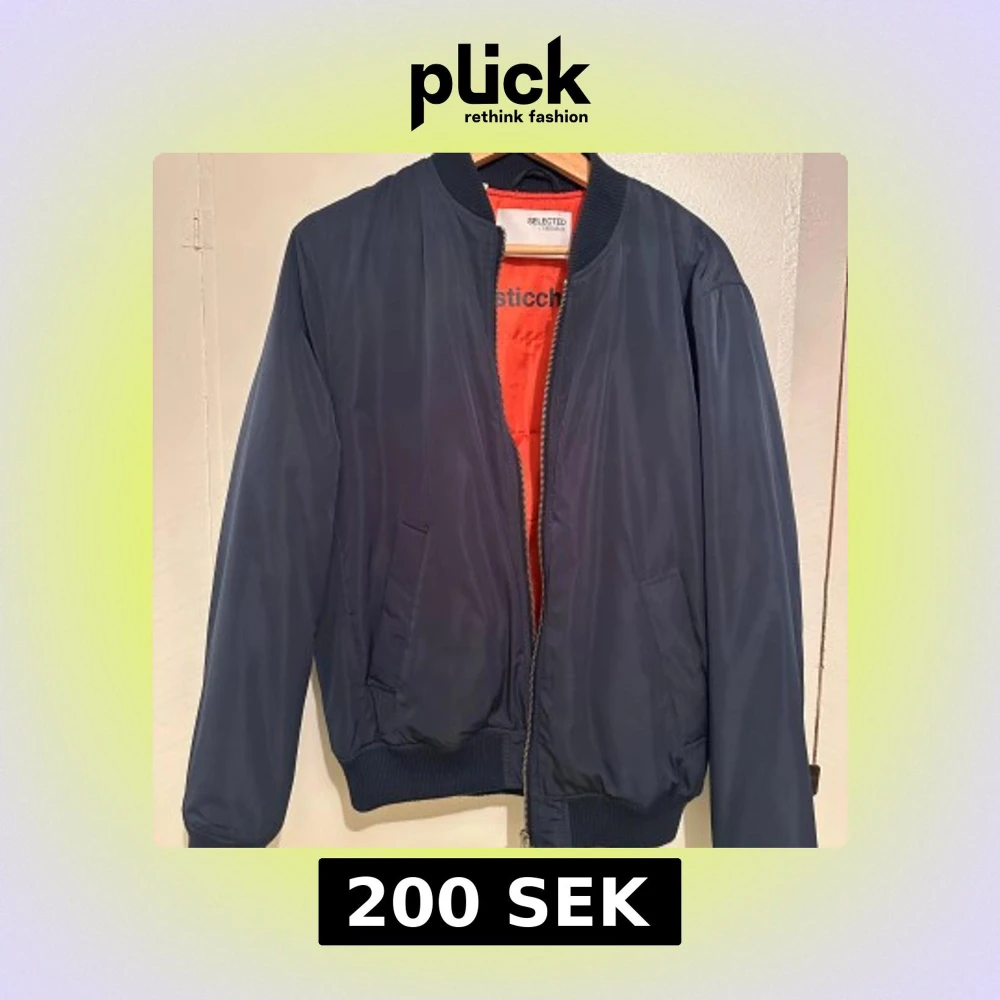 Snygg mörkblå bomberjacka från Selected Homme med orange foder. Jackan har ribbade muddar vid ärmslut, krage och nederkant samt dragkedja framtill. Tillverkad i återvunnen polyester från plastflaskor. Perfekt för dig som gillar stilren och modern look. Jackan är knappt använd.
