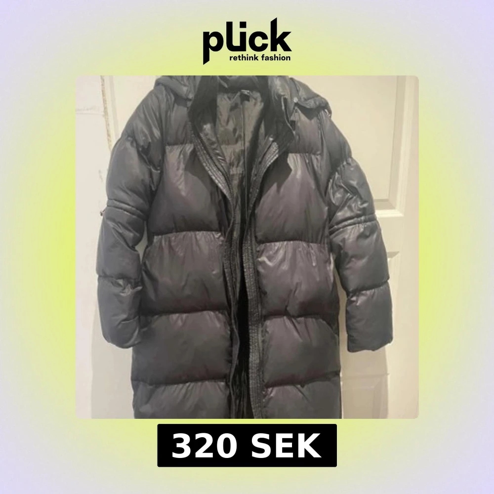 Säljer en svart lång pufferjacka med huva och bälte i midjan. Jackan har dragkedja framtill och är perfekt för kalla dagar. Den är vadderad och har en oversized passform som ger en cool look.